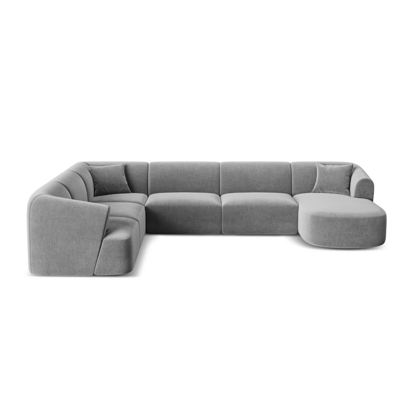 Rechtsseitiges, samtiges, panoramisches 7-sitziges Ecksofa CAMPI in Grau
