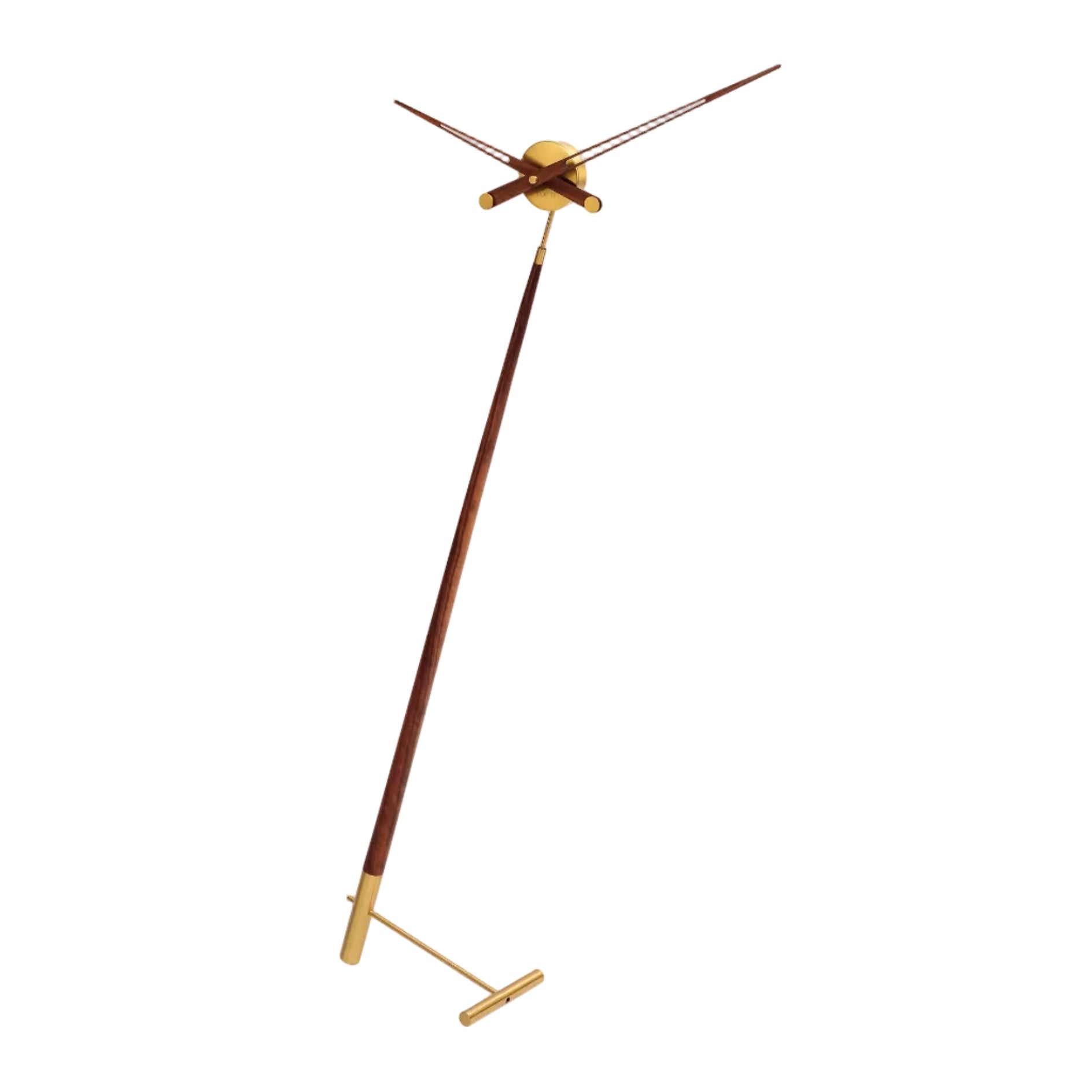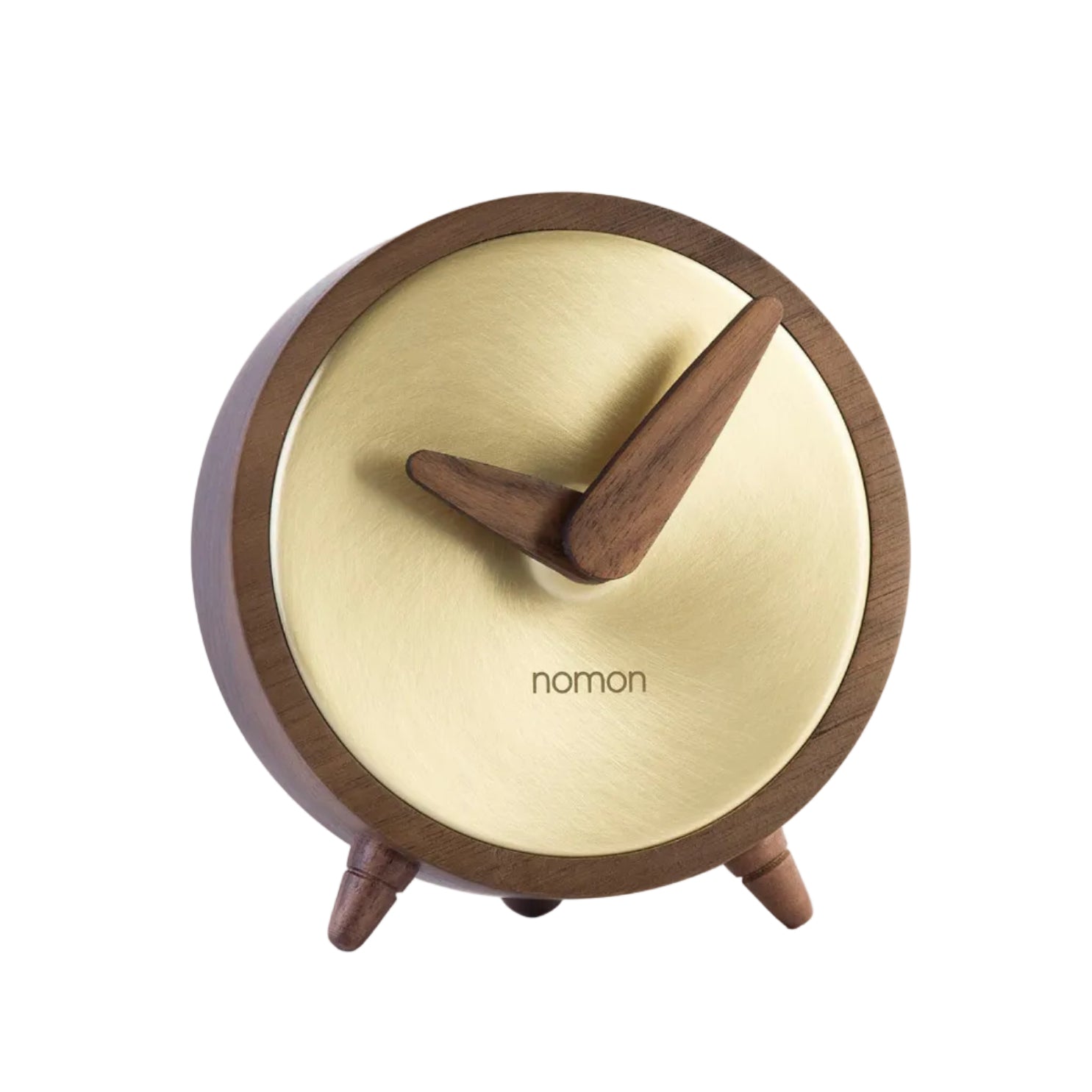 Tischuhr ATOMO aus Nussbaumholz mit messingfarbener Oberfläche