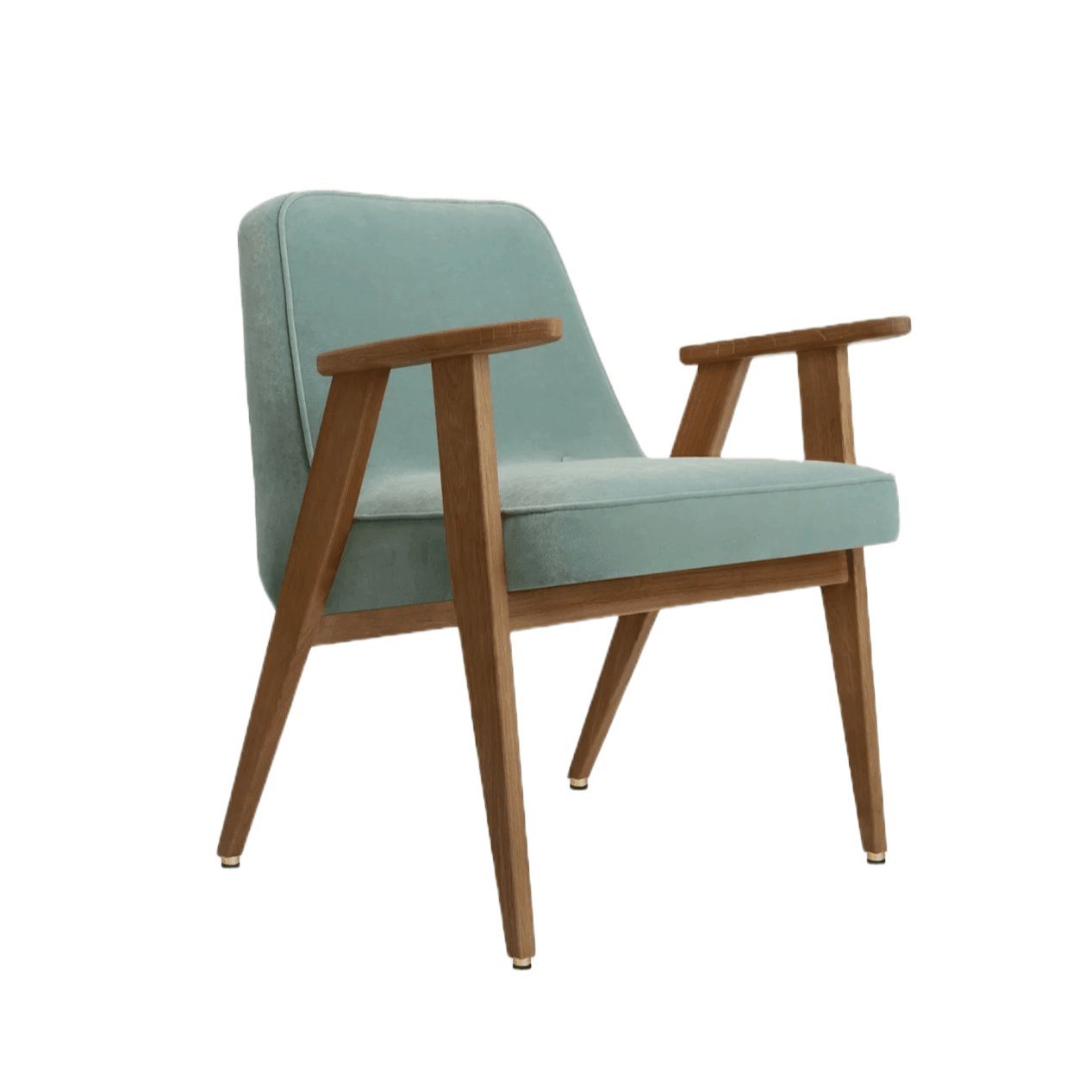 The Chair 366 in Velvet Mint fabric is not just an iconic piece of furniture, but also a work of art. Józef Chierowski's design is incredibly refined and crafted with the highest quality. As a result, the Chair 366 delights not only with its design but also with its durability and comfort. Its seat and backrest are soft and comfortable, allowing for relaxation and rest.
