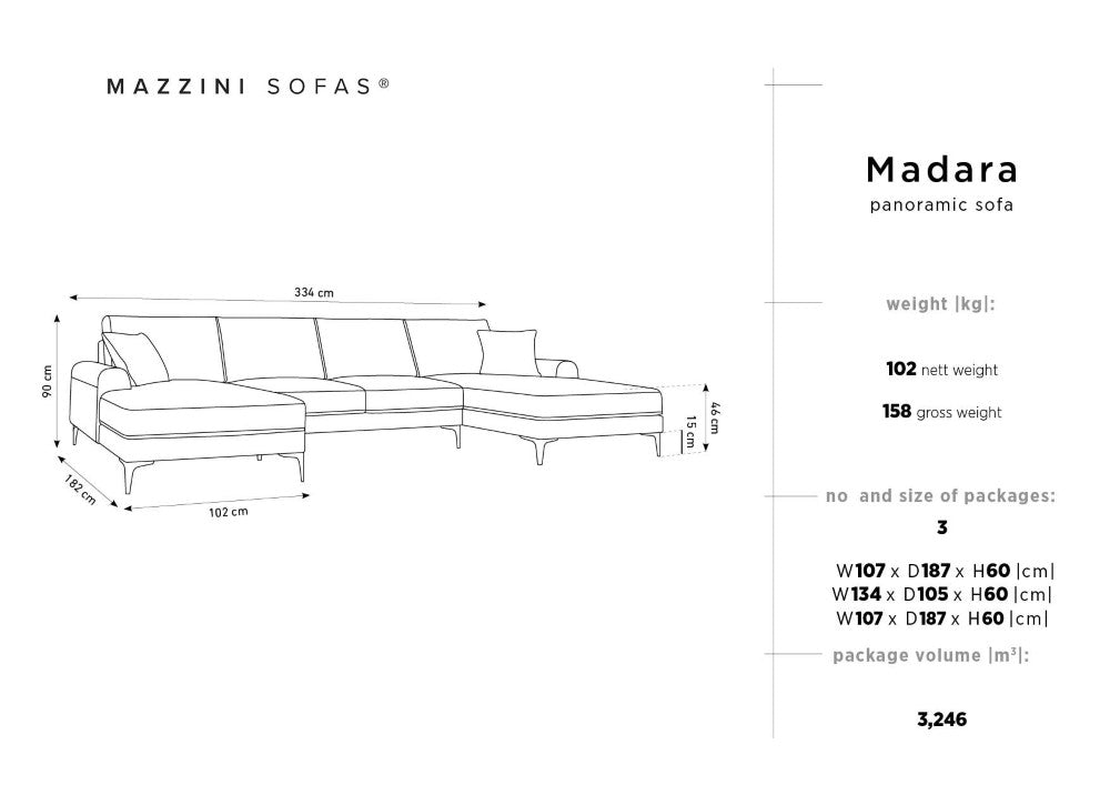 Balanced proportions will bring a touch of elegance to your living room, while details such as seam connections will add sophistication to any arrangement. The shape of the corner sofa is accentuated by stylish legs that add lightness and a unique character to the whole. The semi-circular armrests interestingly break the minimalist shape of the Madara body. When combined with other furniture from the collection, it will create an extraordinary seating set.