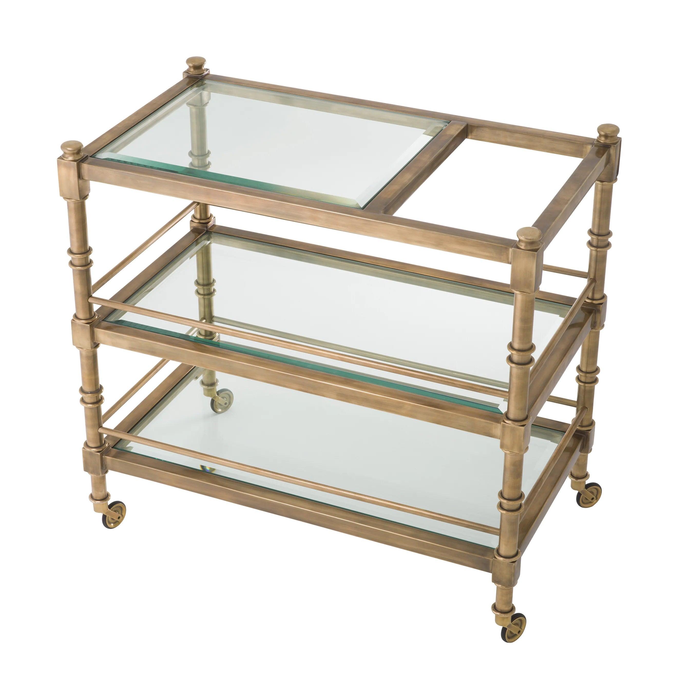 Cart Alexia is a combination of vintage style with functionality that transfers you to the times of old elegance. The brass finish adds a subtle elegance to the furniture, whose old -fashioned beauty is additionally highlighted by three shelves from a phased transparent glass. These shelves are an ideal place to store your collection of alcohols, glasses and other necessary bartending accessories. To ensure the safety of your items, Alexia is equipped with elegant side slats, which not only add character, but above all protect against accidental drops of objects. The unique design, in which the upper shelf is less than the lower two, allows easy access to bottles and glass, which means that the use of the stroller becomes pure pleasure.