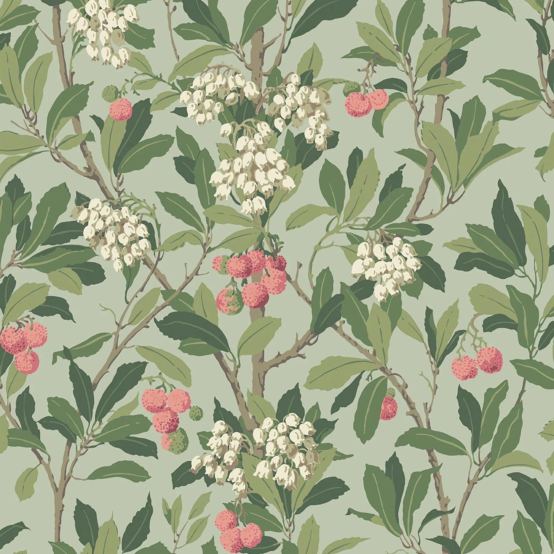 Wallpaper with a plant motif of fruits and leaves ARCHIVE ANTHOLOGY - Strawberry Tree pink on light green