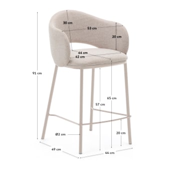 The stylish Maina bar stool is supported by sturdy steel legs with a beige finish, highlighting its modern character. The internal structure made from FSC Mix Credit certified wood guarantees durability and a responsible approach to the environment, making this bar stool an excellent choice for elegant, thoughtfully designed interiors.