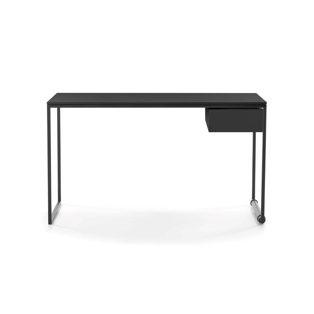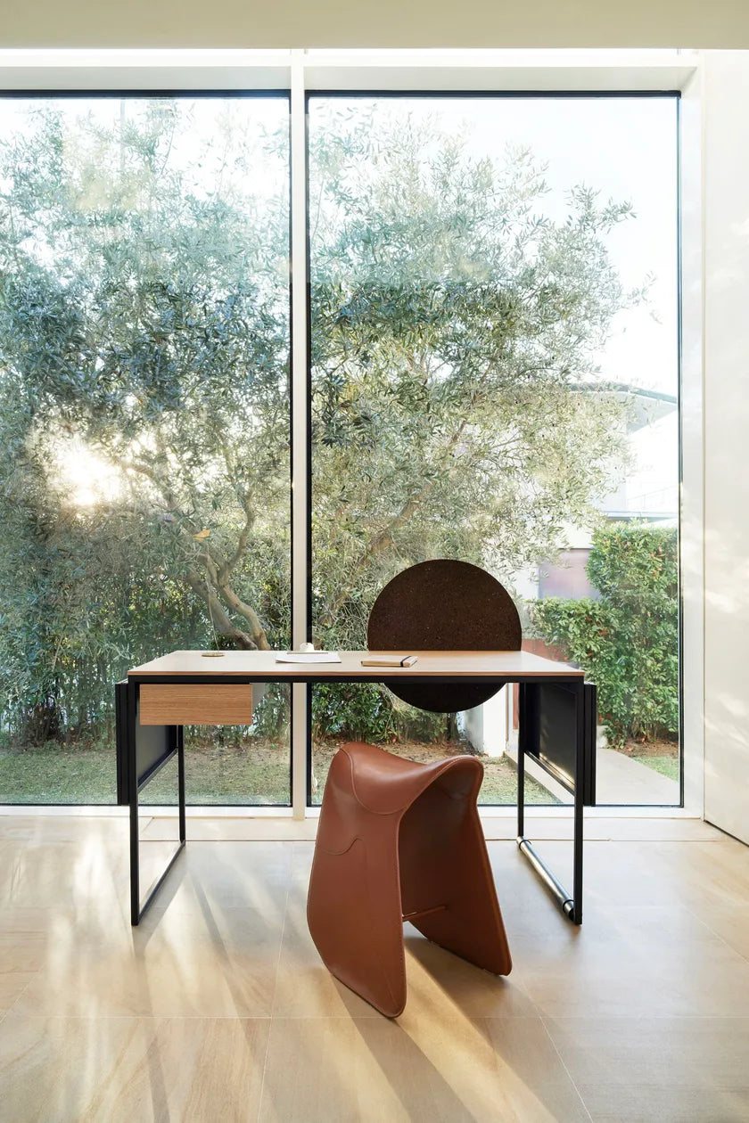 Macis Desk designed by Lapo Ciatti is a functional and elegant response to the dynamic needs of contemporary interiors. With its sleek steel construction and thin top made of wood or PET material, the piece combines simplicity of form with a distinctive character. The use of an aluminum wheel with a protective coating allows for easy movement of the desk, making it an ideal choice for a home office, studio, coworking space, or modern study.