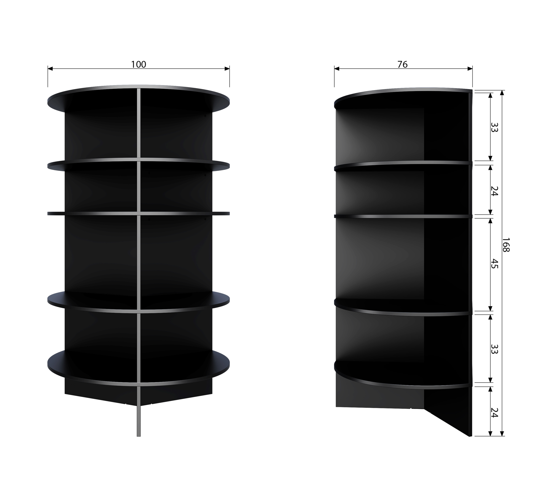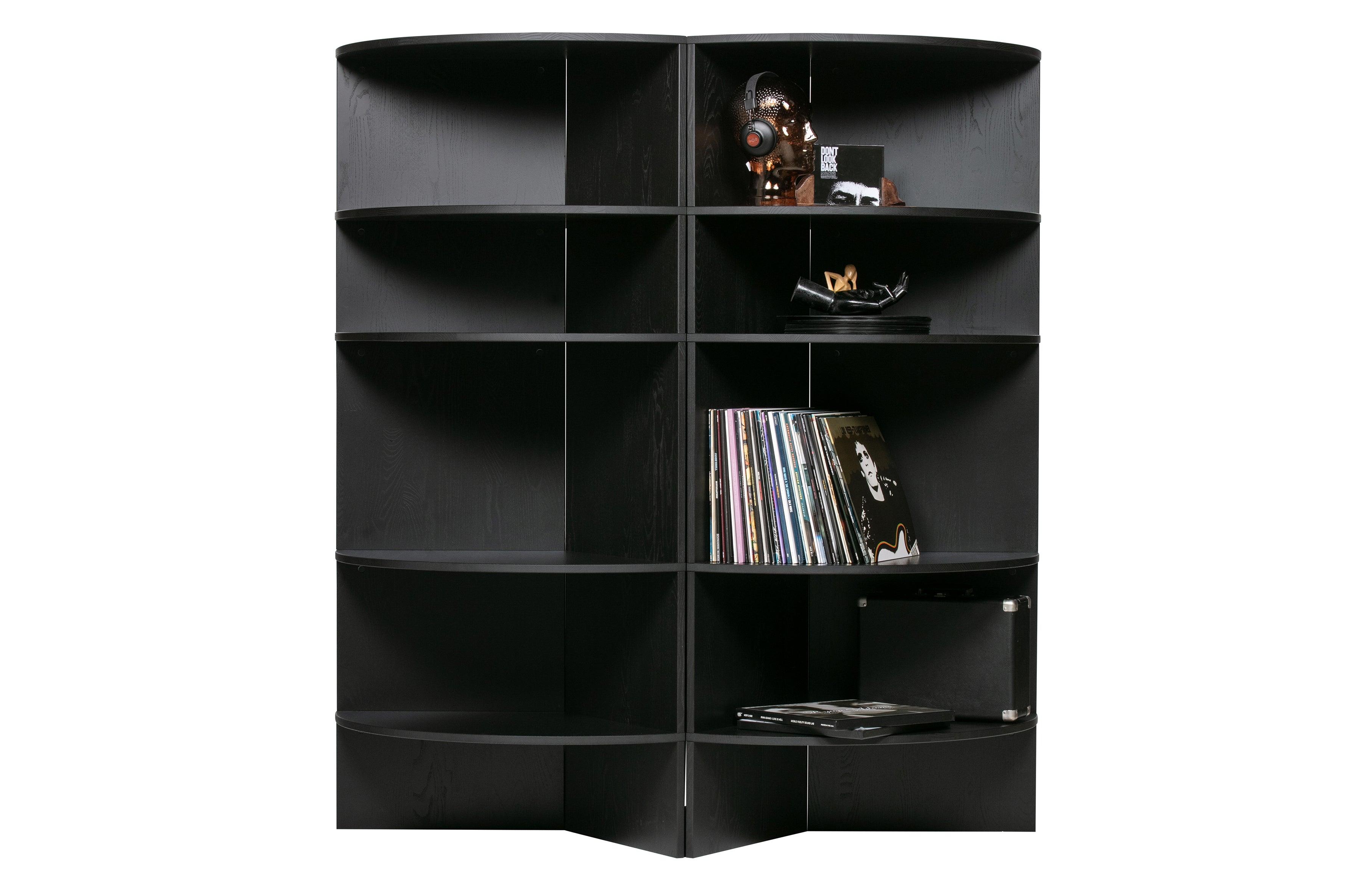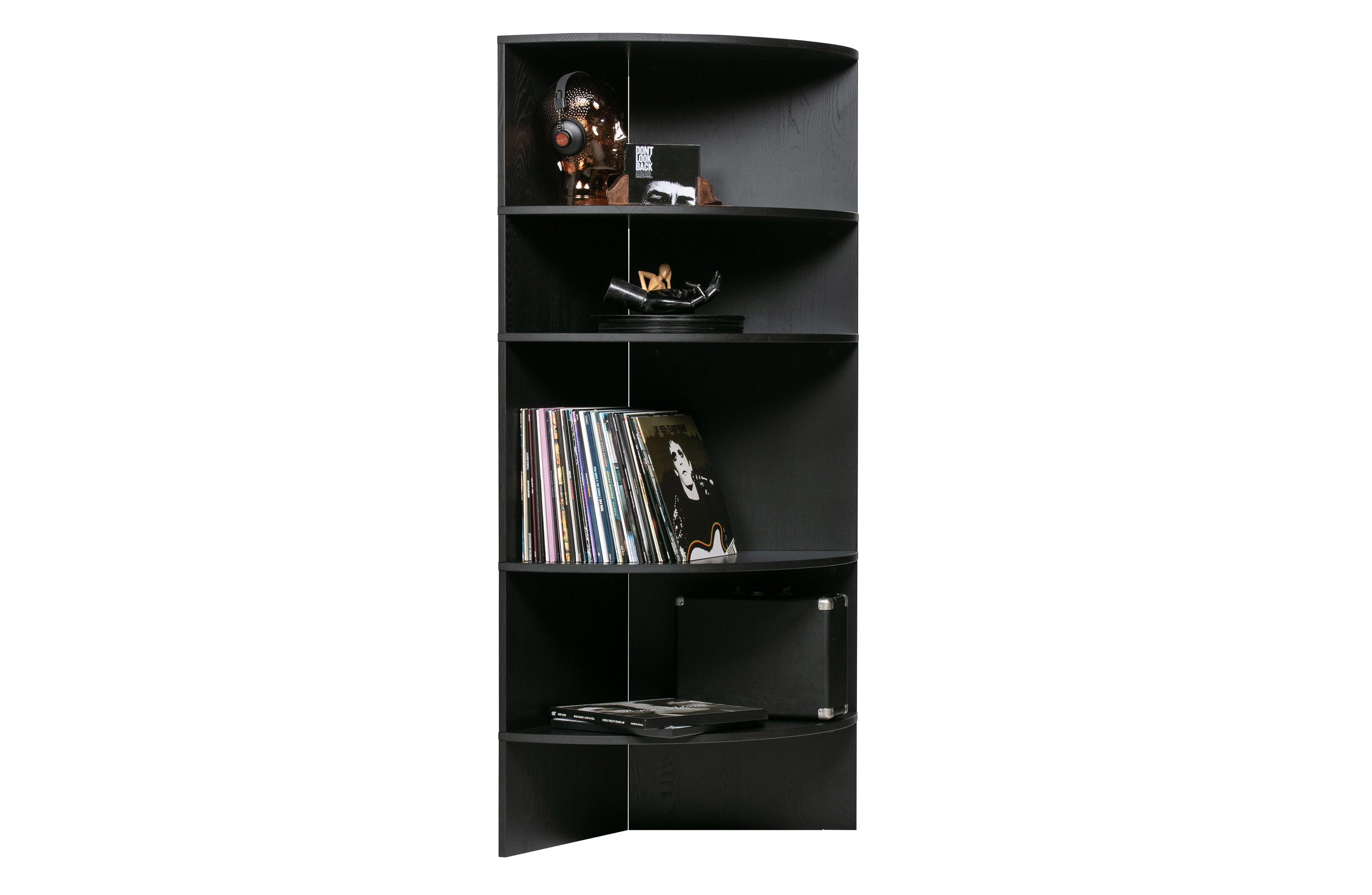 Shelf Trian is made of certified pine wood and finished in deep black. This unique piece of furniture combines open compartments and a round shape, creating a stylish whole while offering plenty of space to store the most beautiful accessories.