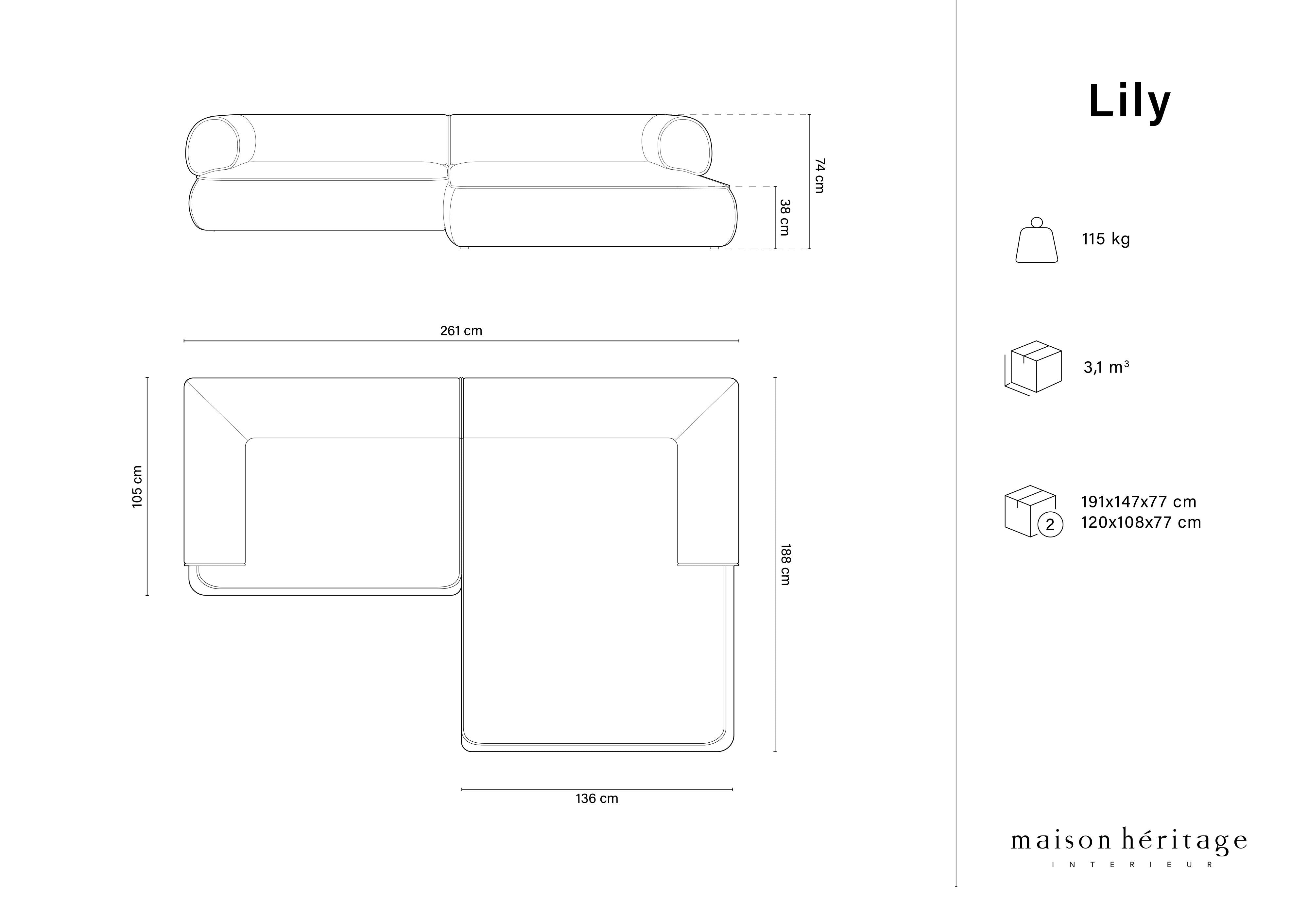 The stylish corner sofa Lily adds a touch of timeless elegance to any interior. Its unique form is the result of a modern approach to classic furniture shapes. The rounded edges of the seats have an exceptionally original shape, while the backrests provide the right comfort during relaxation. The chenille fabric upholstery is not only practical but also pleasant to the touch.