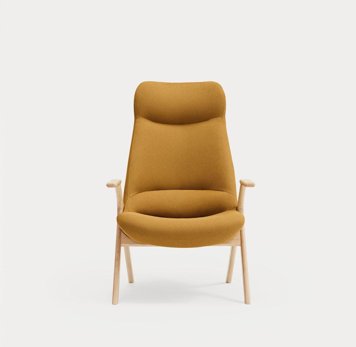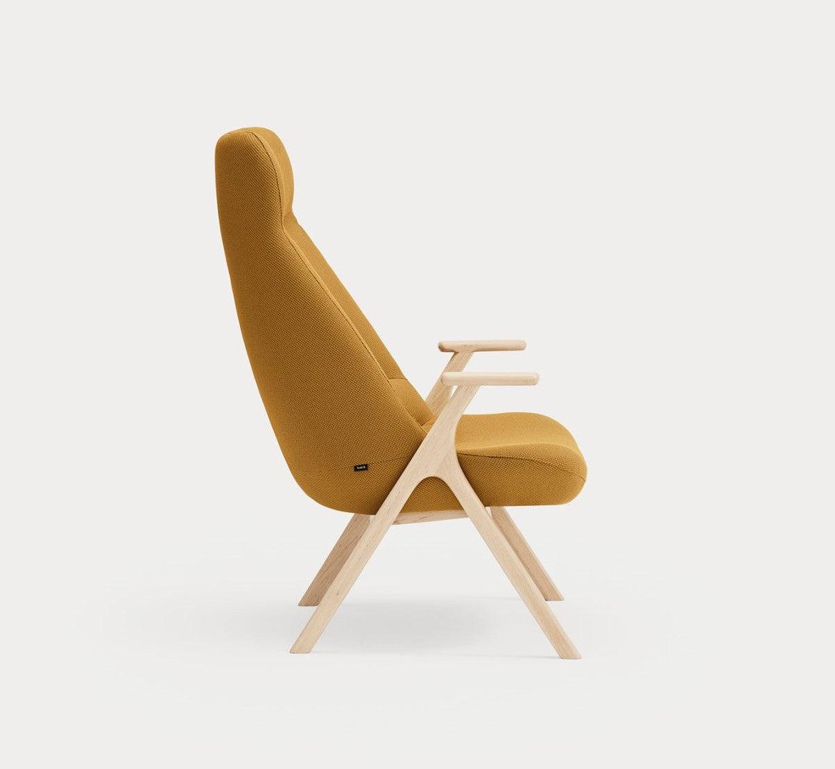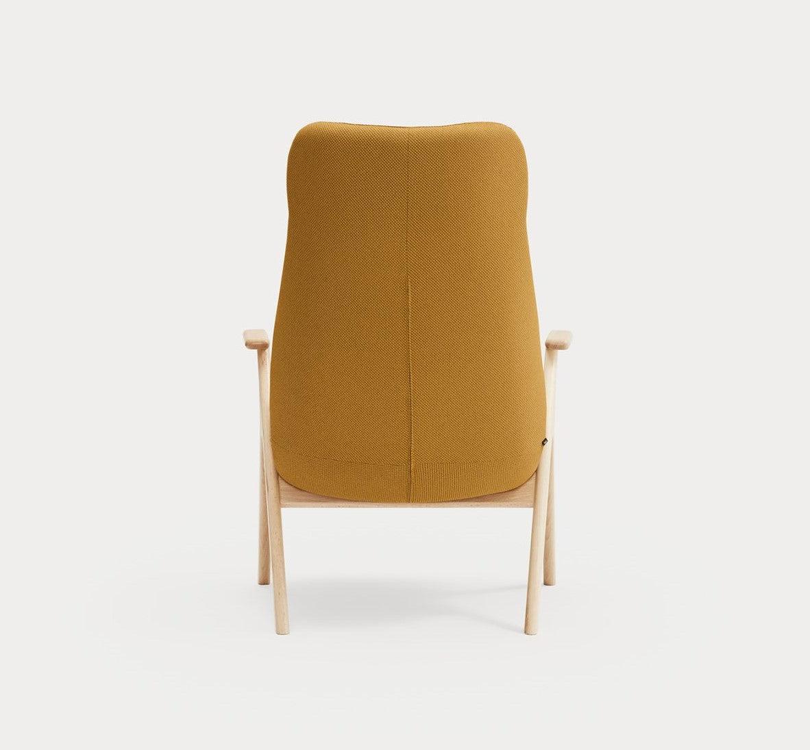 High armchair Dins in mustard color is a piece of furniture that combines two opposing concepts that coexist in the harmony of proportion. The delicacy and warmth of the wooden Dins chair structure are fully integrated with a spacious upholstered body, which is distinguished by a higher support than standard seats.