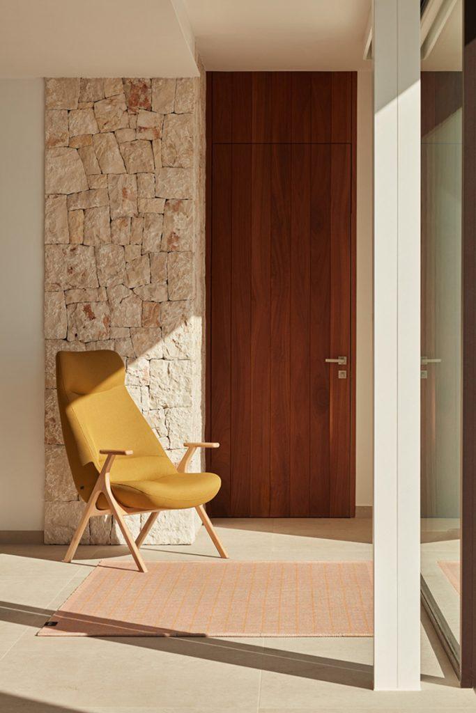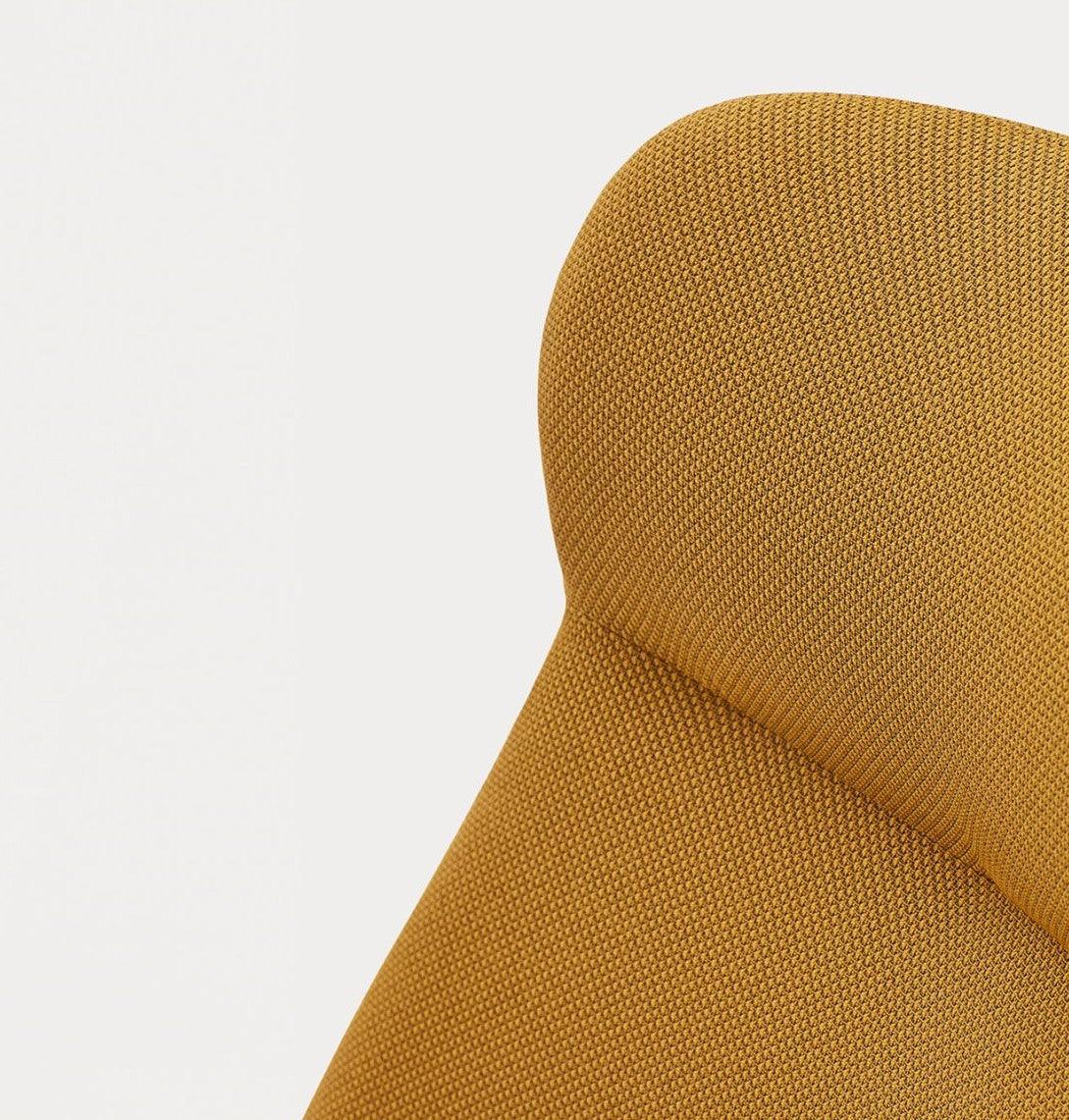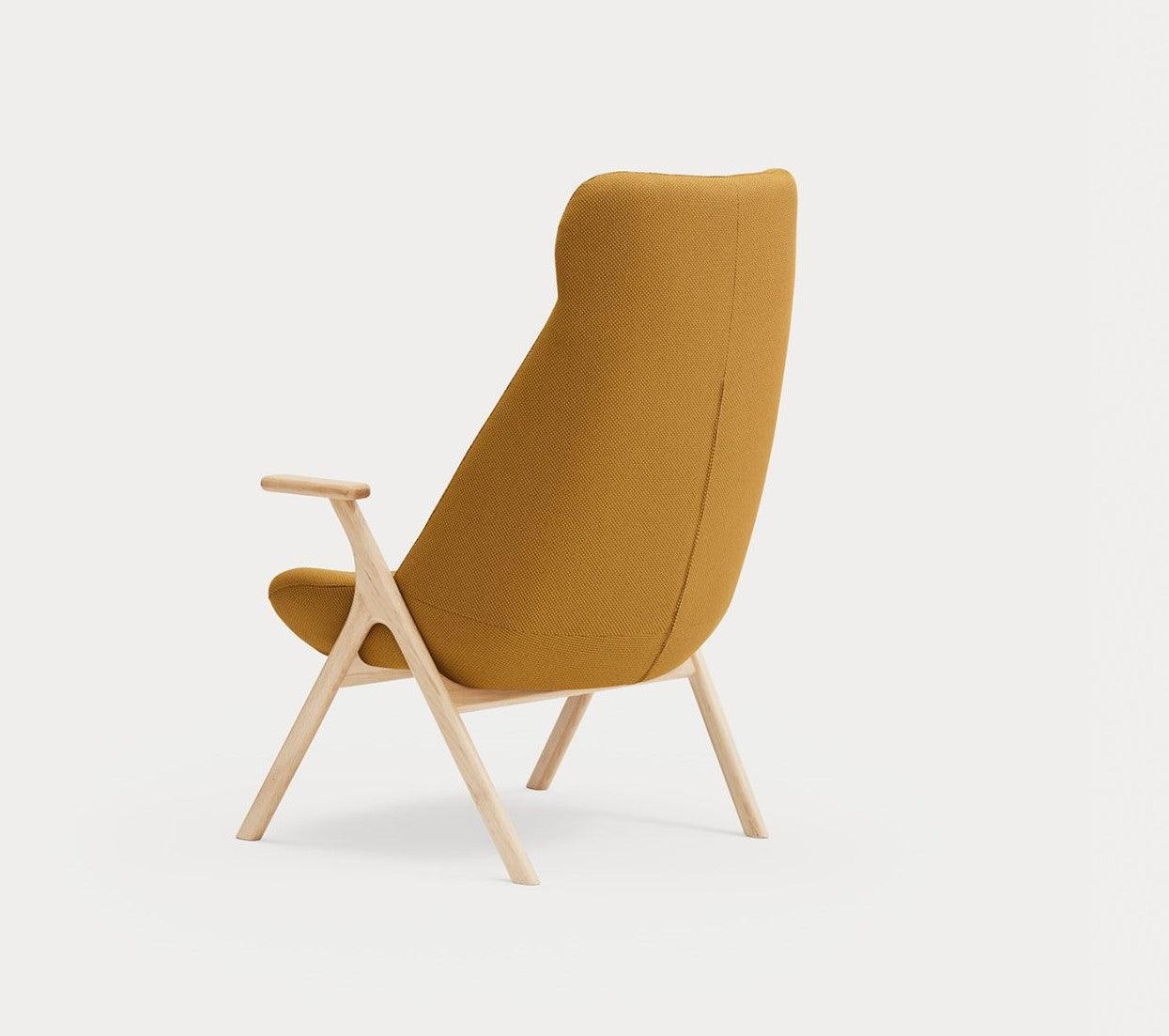 High armchair Dins in mustard color is a piece of furniture that combines two opposing concepts that coexist in the harmony of proportion. The delicacy and warmth of the wooden Dins chair structure are fully integrated with a spacious upholstered body, which is distinguished by a higher support than standard seats.