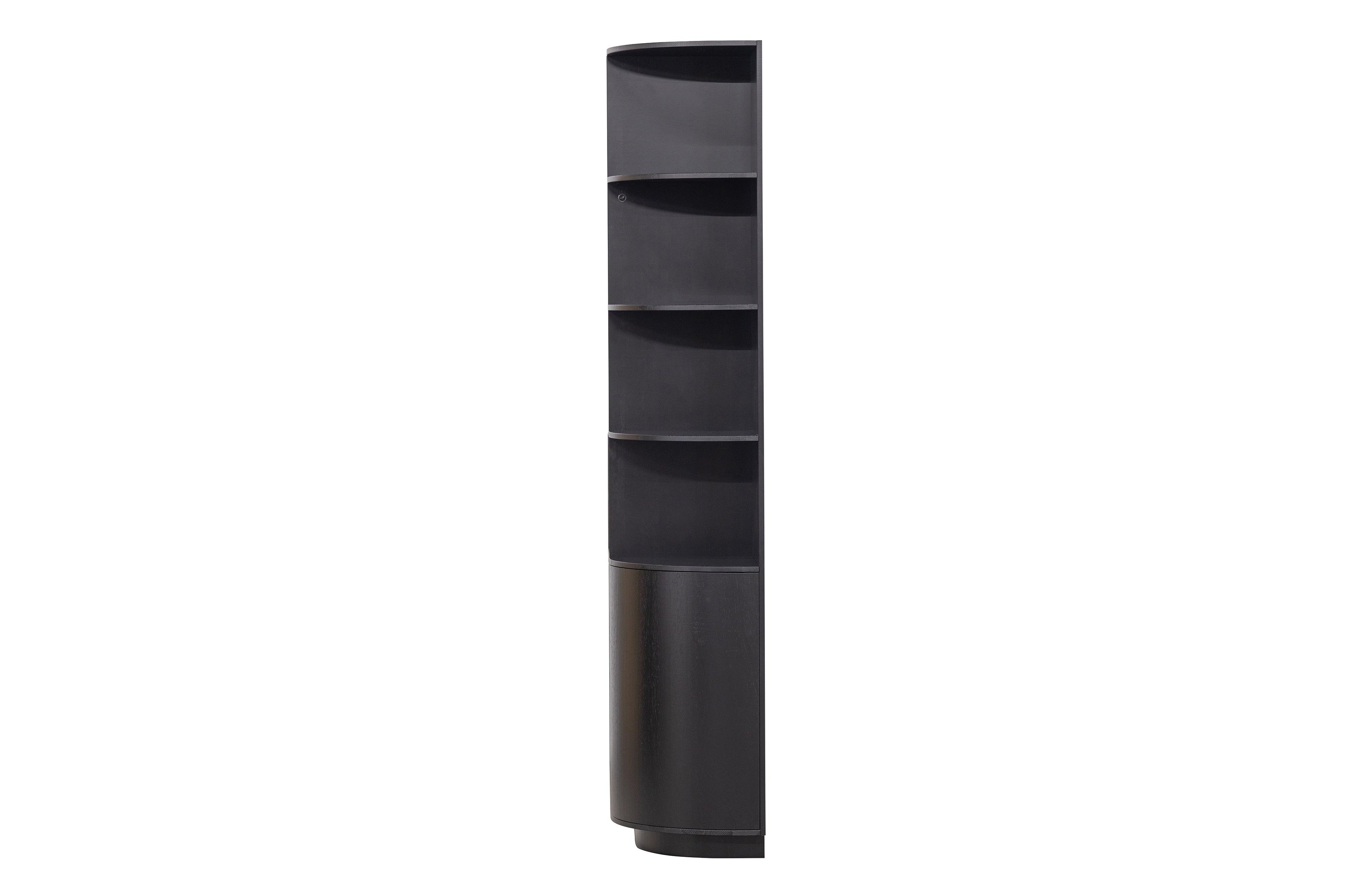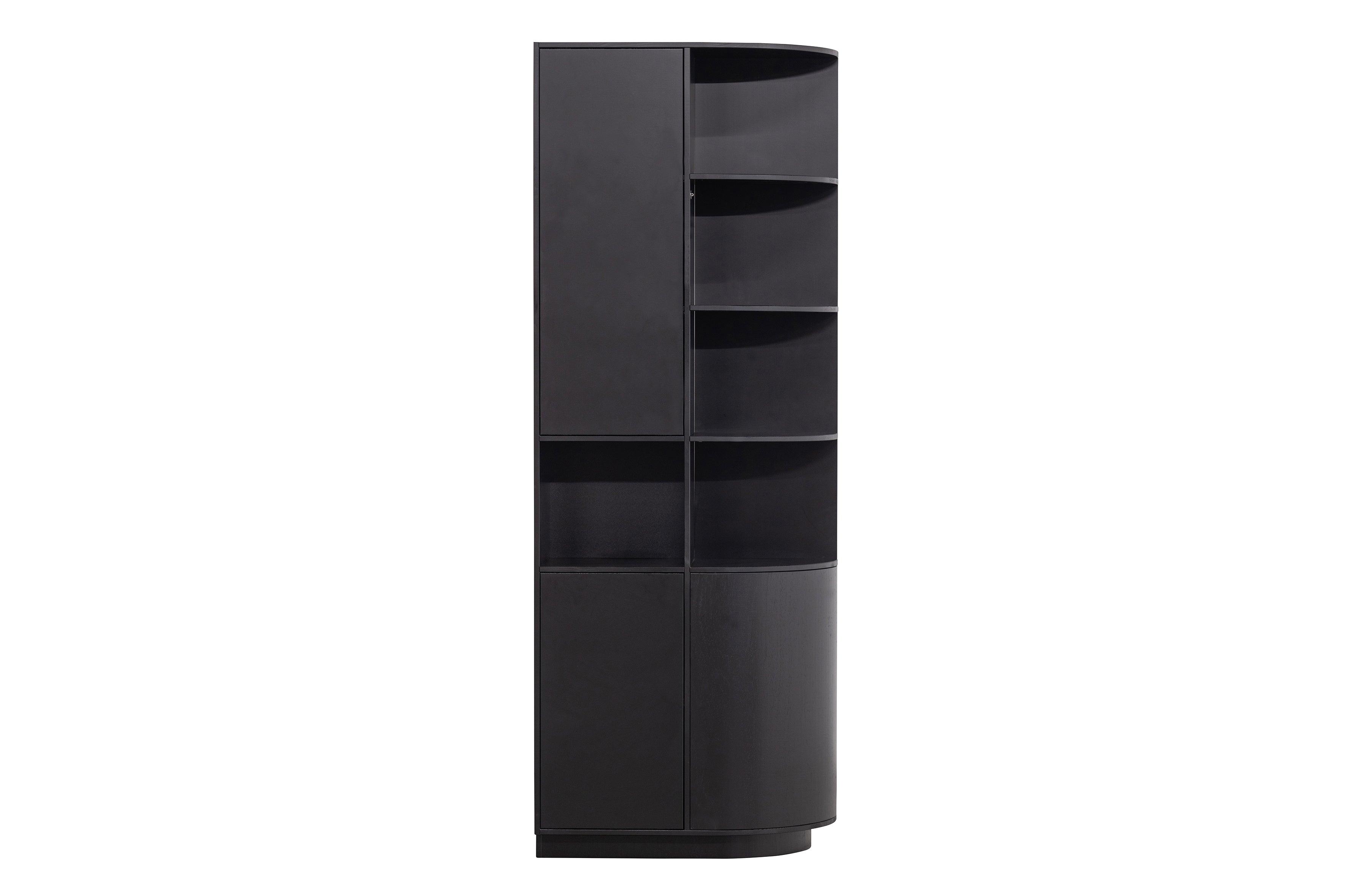 The Fianca Shelf is made from certified pine wood and finished in deep black. This unique piece of furniture combines open and closed compartments, creating a stylish whole while offering plenty of space to store your most beautiful accessories.