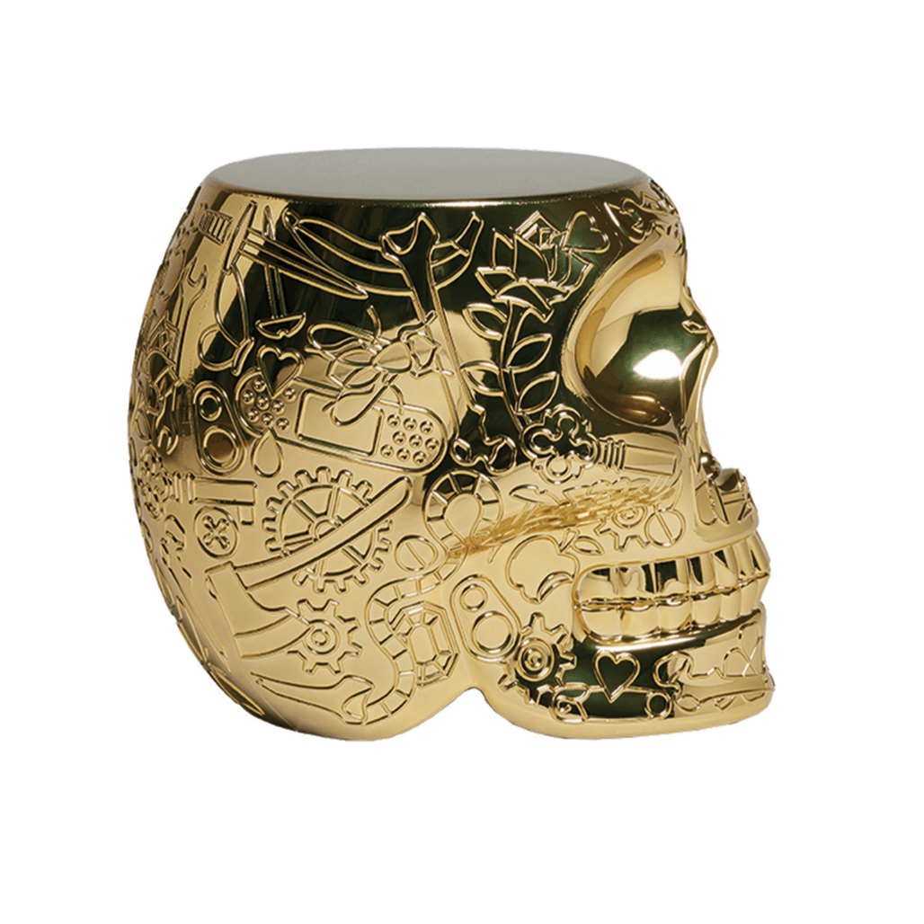 Designer stool Mexico, designed by Studio Job, is a skull-shaped design with a graphic pattern on the surface, serving as both a stool and a table. This design is inspired by the Day of the Dead — Día de los Muertos, a vibrant celebration in Mexico. This colorful and musical event has an incredibly joyful character, which the creators aimed to capture in the design.