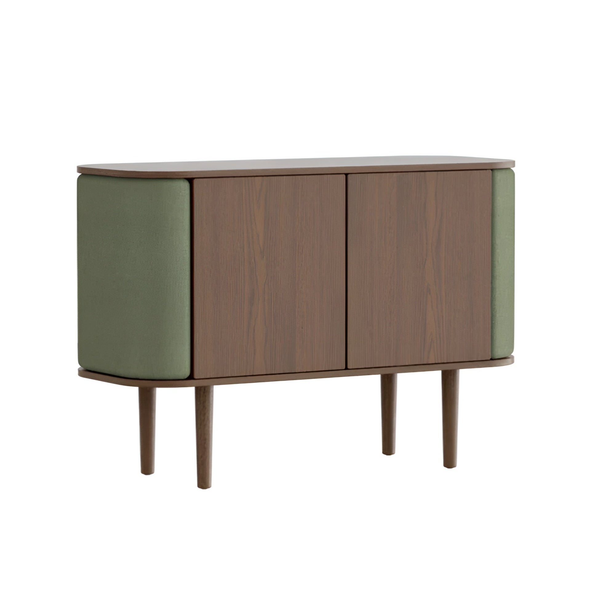 The Treasures commode is available in three colors: natural oak, dark oak, and black oak. The side panels of the cabinet can also be further decorated with Venetian reed, one of four carefully selected colors of Horizons fabric, which is made from 100% recycled materials, or brown artificial leather. The doors of Treasures are interchangeable, meaning you can easily change the upholstery yourself and refresh the look of the furniture, thus saving the resources of our planet.