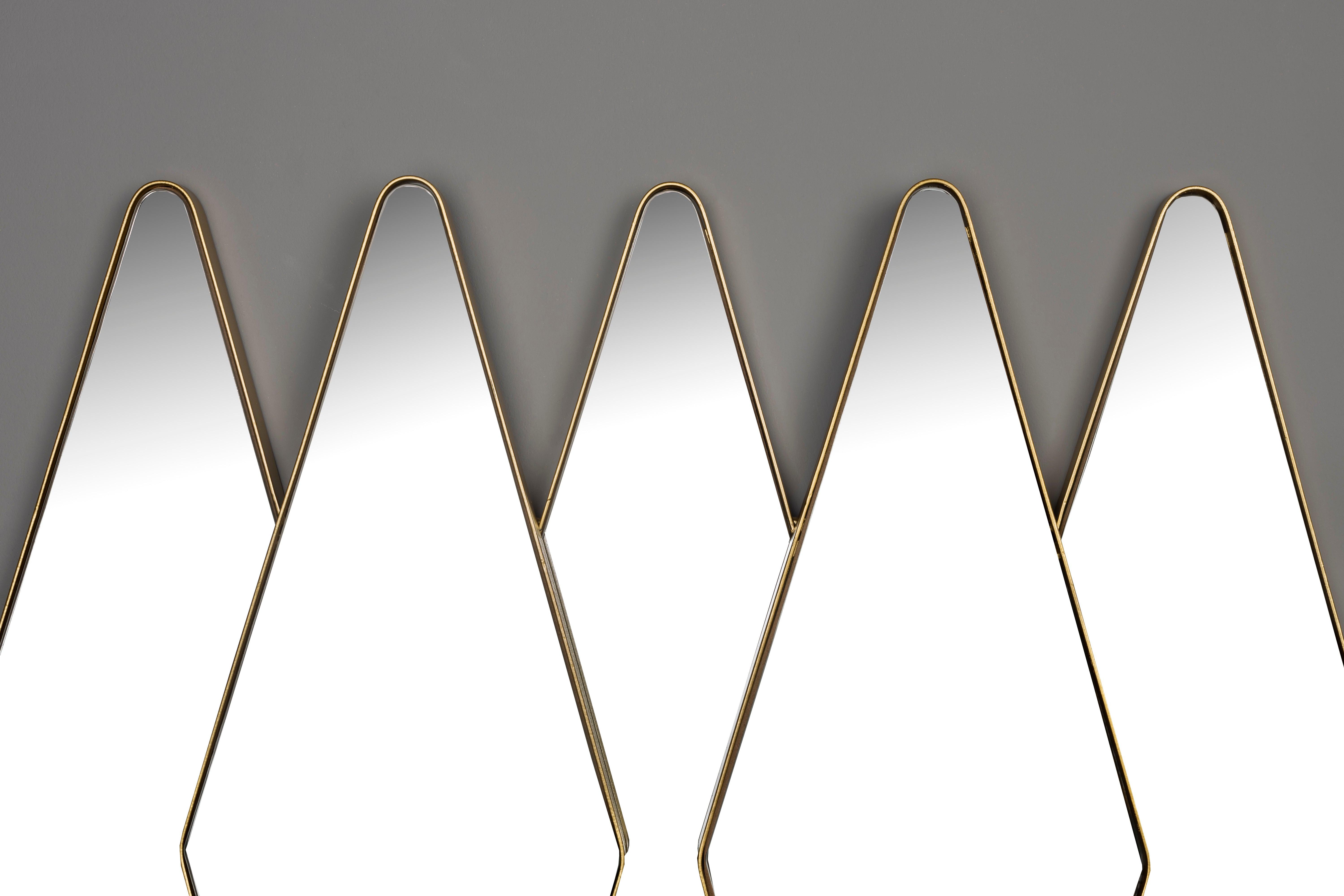 The wall mirror Kyoko is made of glass and metal. It consists of five diamond-shaped mirrors with rounded corners and a brass edge. The inspiration from 70s design gives it a unique style that brings a warm, nostalgic atmosphere to the interior.
