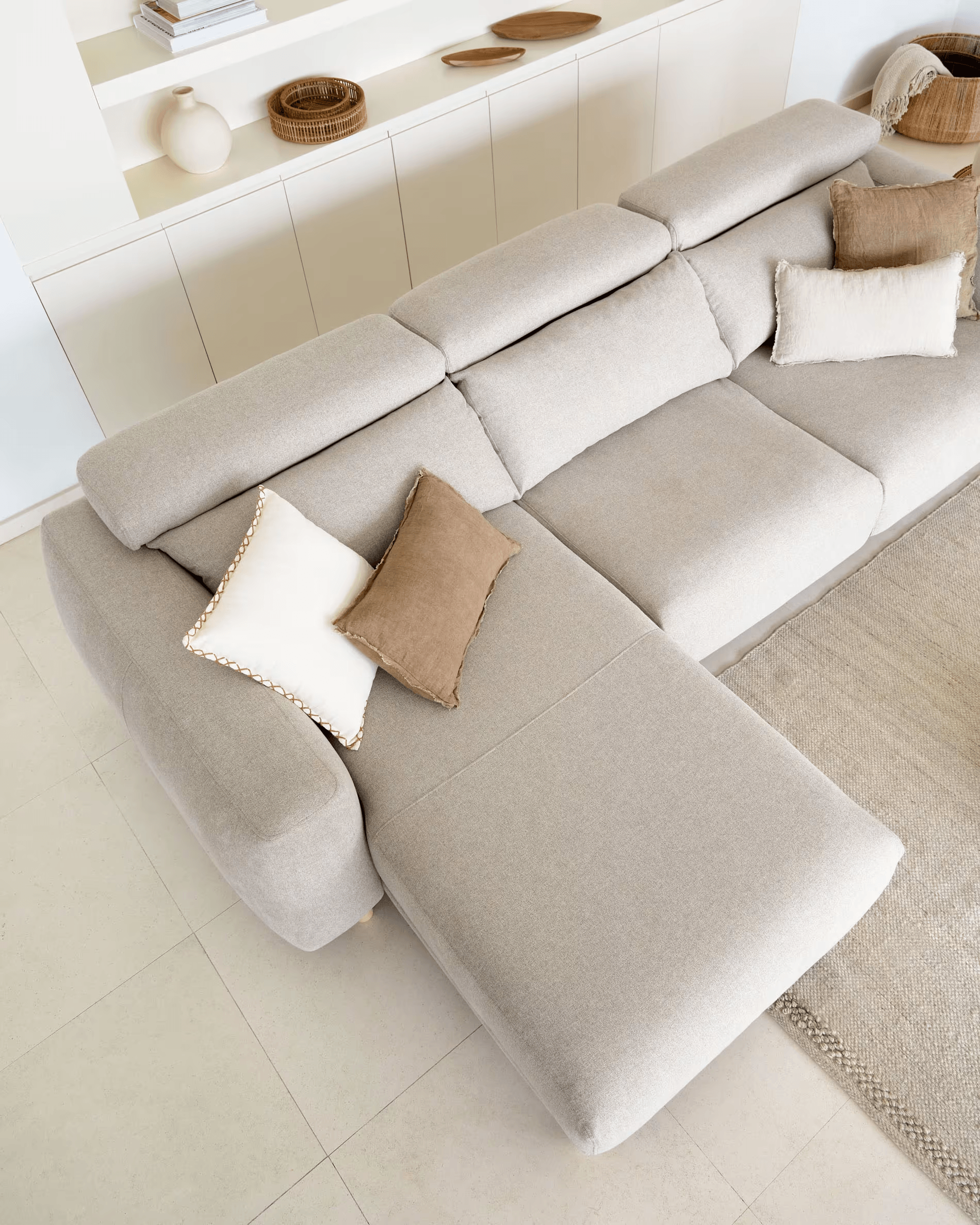 Corner Sofa available in beige, not only looks stylish but also versatile, fitting into various room arrangements. The reclining headrests and sliding seats add functionality to the furniture, allowing it to be tailored to the individual preferences and needs of the user.