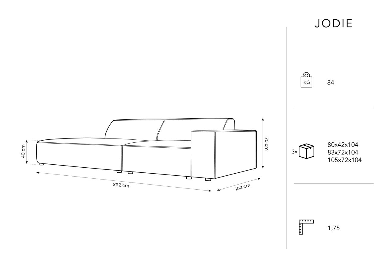 Jodie is a modern, one-sided open sofa with space for three people. The sofa has been designed with functionality and user comfort in mind. The option to choose between left or right opening allows for customization to individual needs and preferences.