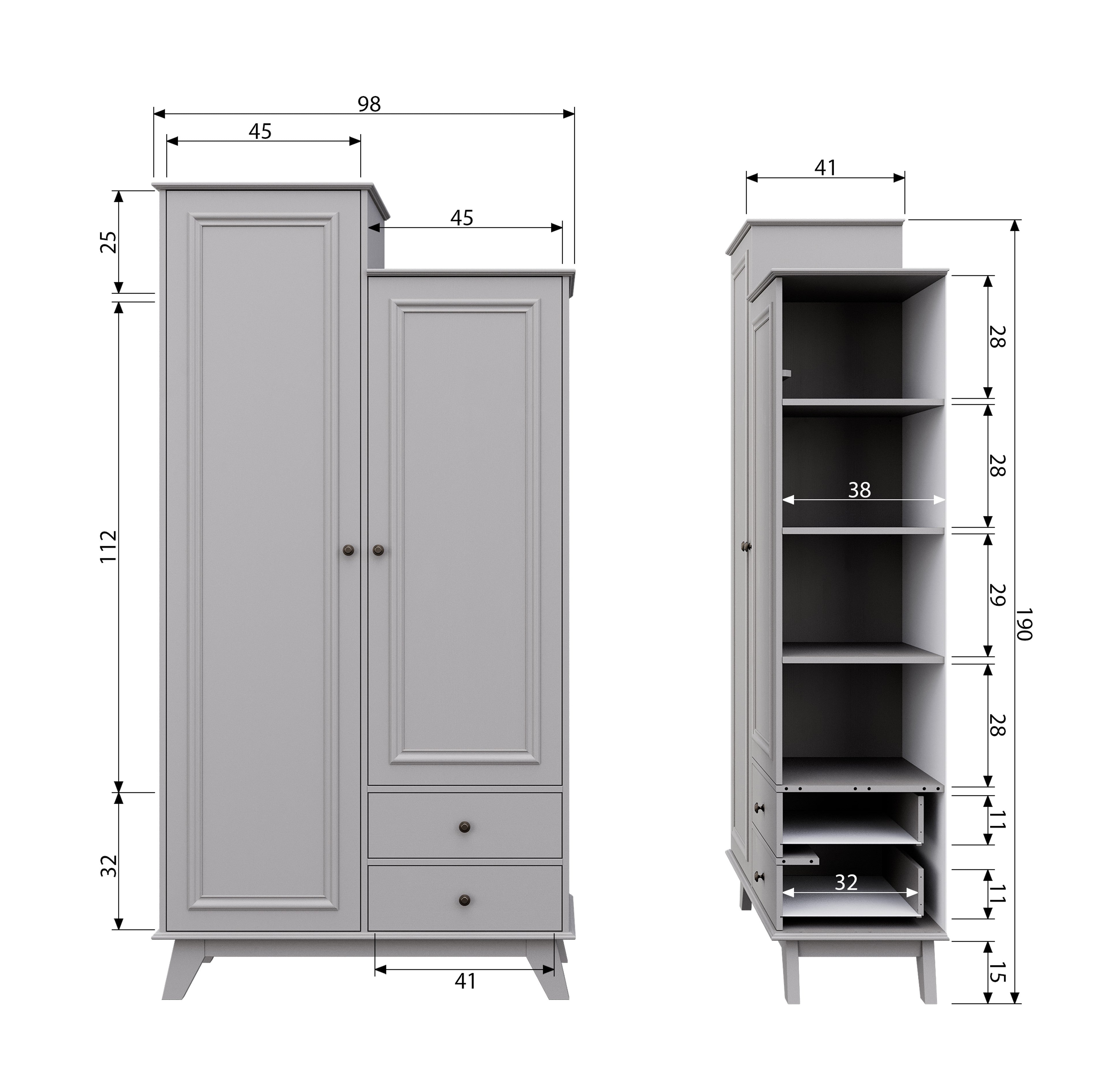 The interior of the wardrobe typically includes a hanging rail and shelves. In the lower part of the wardrobe, there are deep drawers, allowing you to store everything you need.