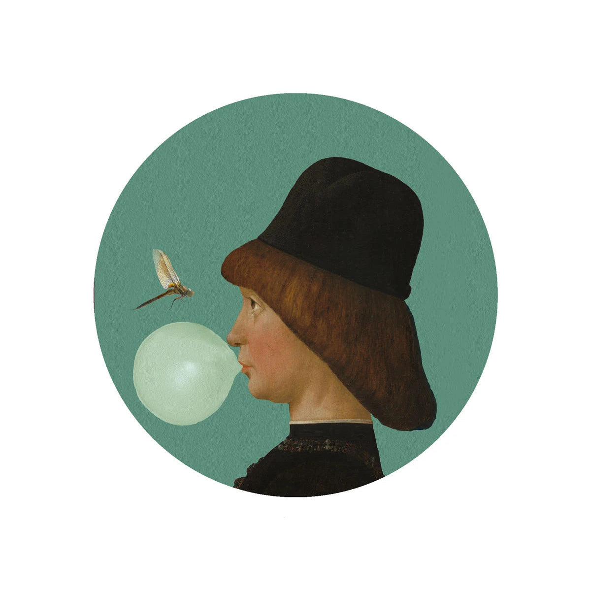 Immerse yourself in the artistic narrative with Dots - Boy and Dragonfly, a round mural that combines a Renaissance portrait with a boy and a contemporary element in the form of a dragonfly. Ideal for those who value a unique combination of history and modernity in their interior.