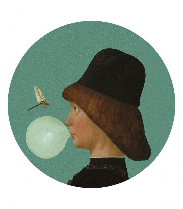 Immerse yourself in the artistic narrative with Dots - Boy and Dragonfly, a round mural that combines a Renaissance portrait with a boy and a contemporary element in the form of a dragonfly. Ideal for those who value a unique combination of history and modernity in their interior.