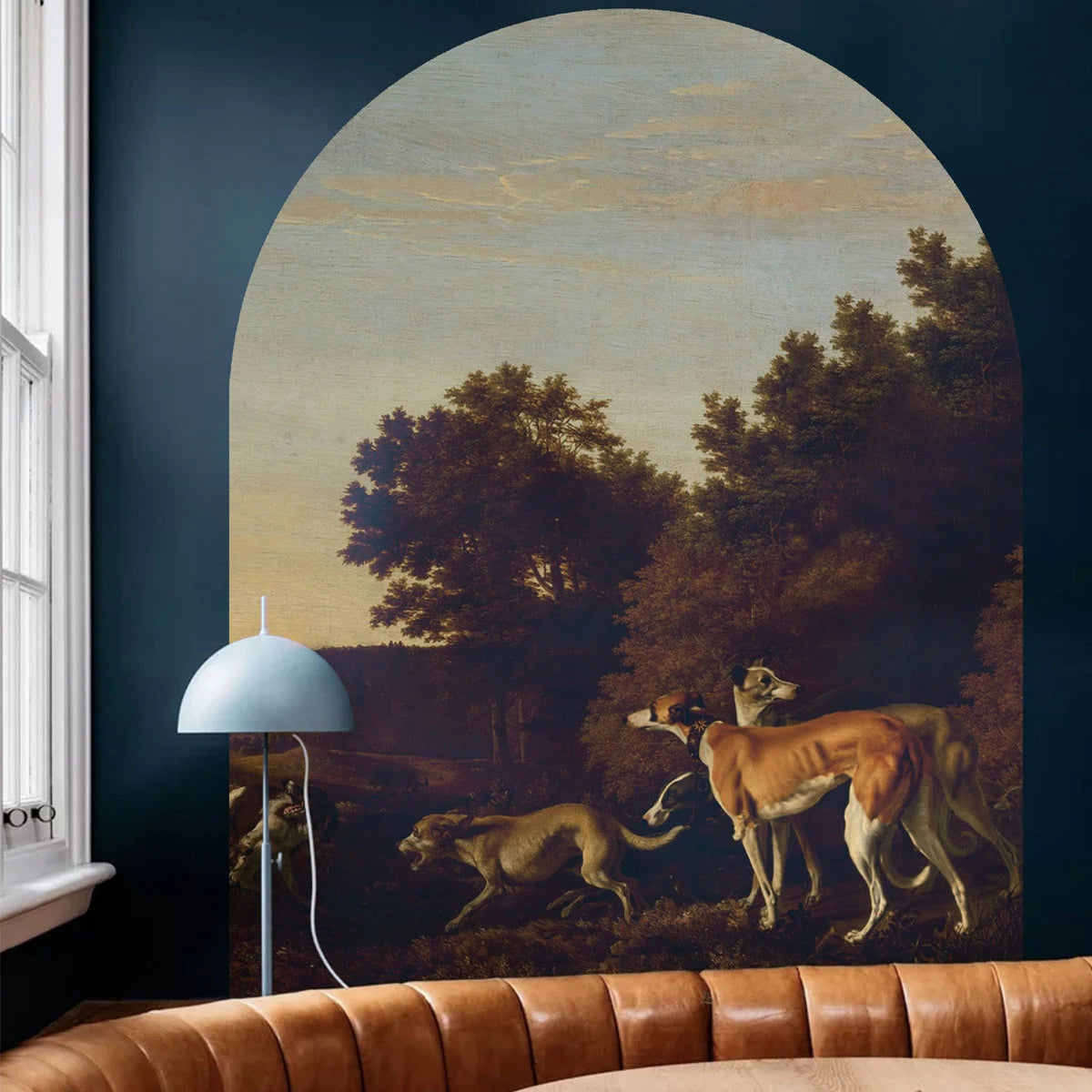 Arch-shaped mural Chart is a wall decoration featuring a classic hunting scene motif with dogs against a natural backdrop, bringing elegance and a timeless character to the interior. Realistic details and subtle shades lend sophistication to the composition, creating a harmonious image inspired by the tradition and art of bygone eras. Mural becomes a stylish accent that warms the space and highlights its dignified atmosphere.
