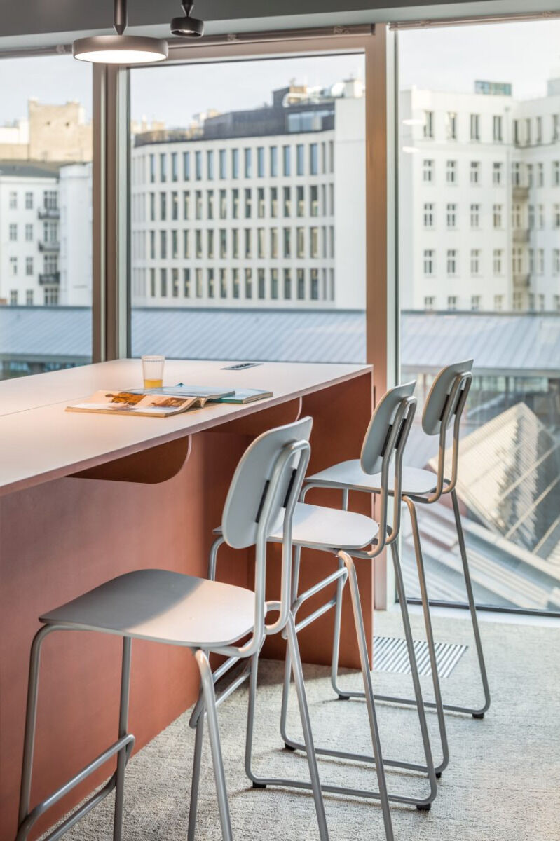 The metal frame combined with the seat and plywood support gives the furniture a modern character, highlighted with a wide range of colors. Hokery can be stacked up to 5 pieces, which facilitates their storage and space management. The stool is easy to care for and ideal for dynamic, often changing arrangements in public places.