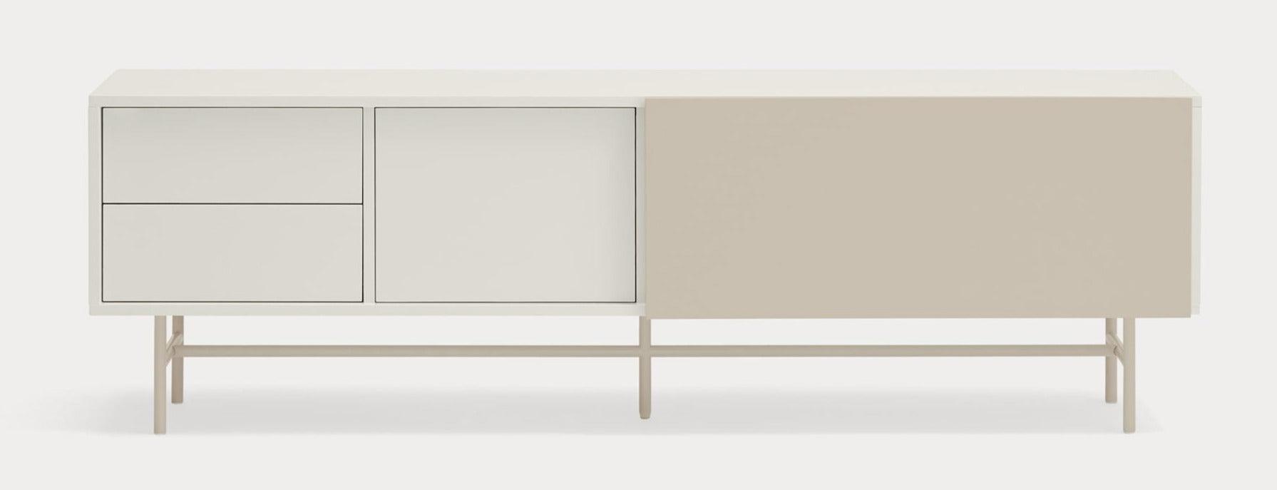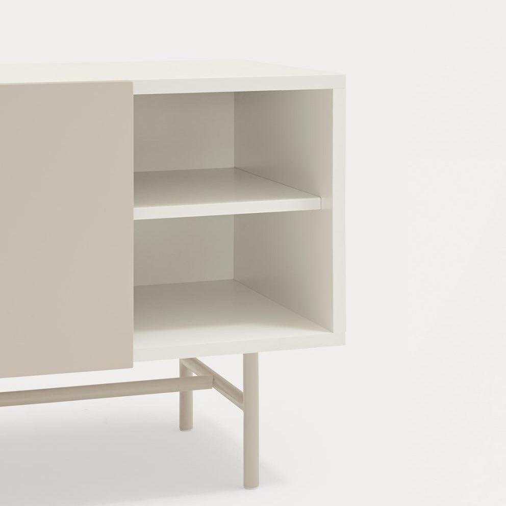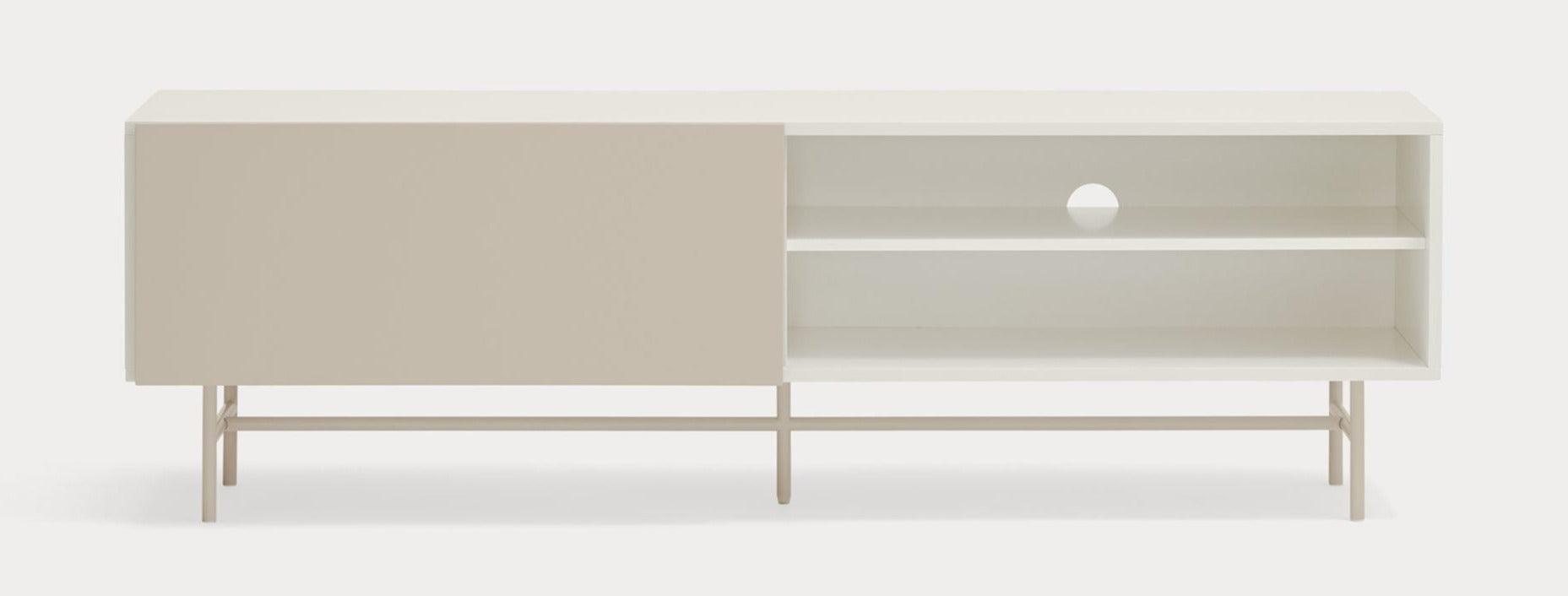 RTV cabinet with a unique beige white color. The Nube collection is distinguished by an unusual and expressive configuration thanks to the sliding door, which can be freely set up, adapting to individual preferences. The way this door moves on the Nube RTV cabinet, revealing and hiding various parts of its interior, derives inspiration from the way the clouds move in the sky.