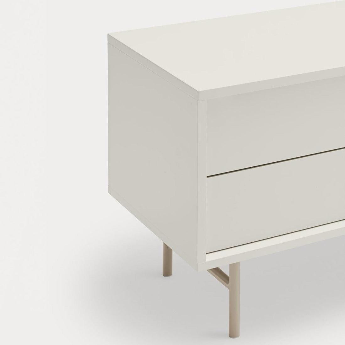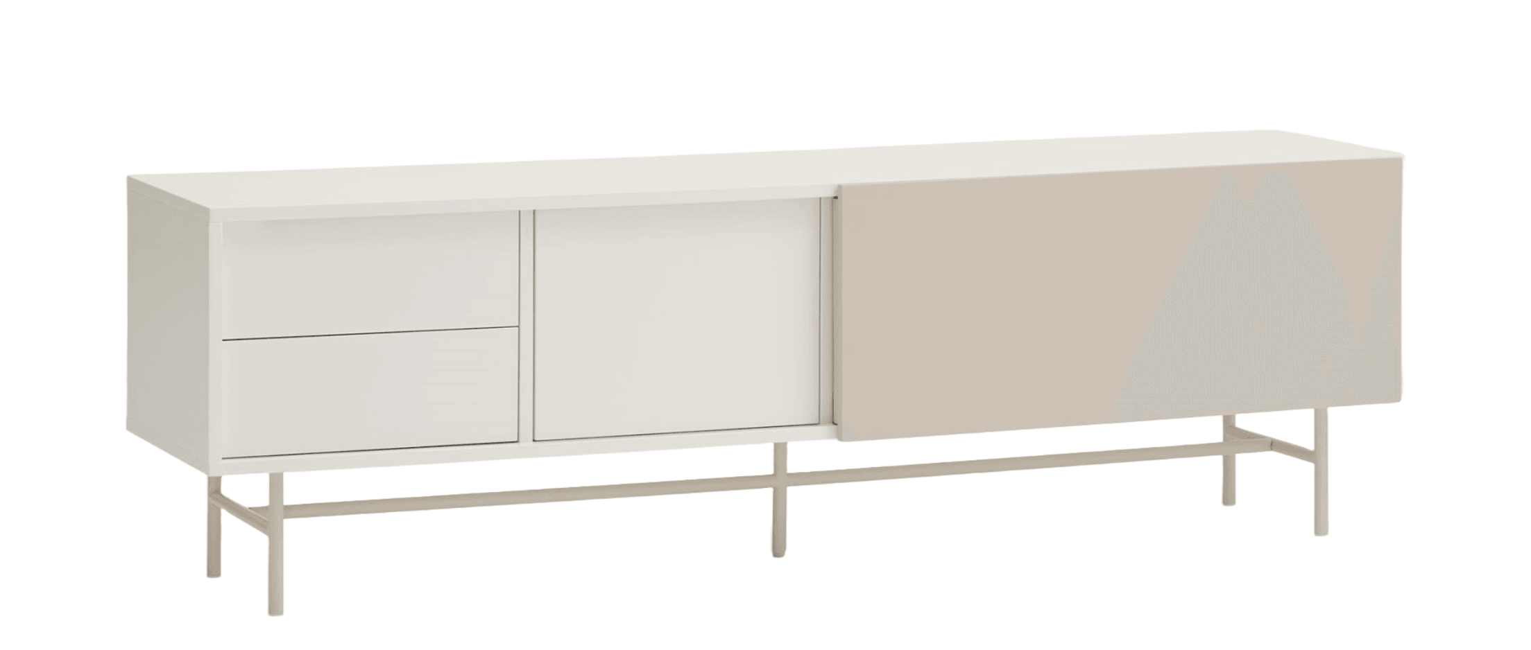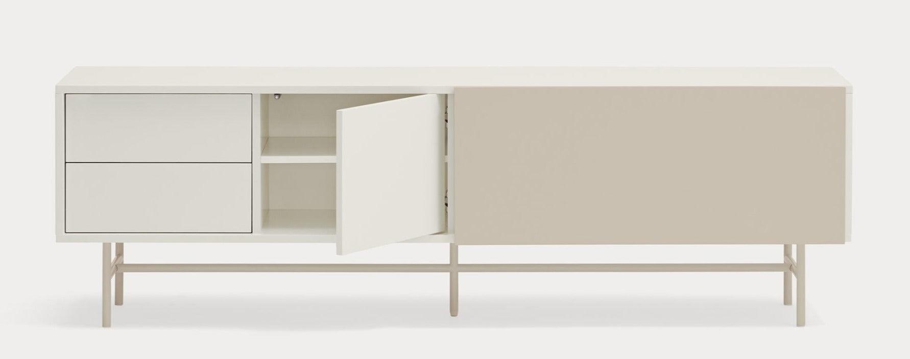 RTV cabinet with a unique beige white color. The Nube collection is distinguished by an unusual and expressive configuration thanks to the sliding door, which can be freely set up, adapting to individual preferences. The way this door moves on the Nube RTV cabinet, revealing and hiding various parts of its interior, derives inspiration from the way the clouds move in the sky.
