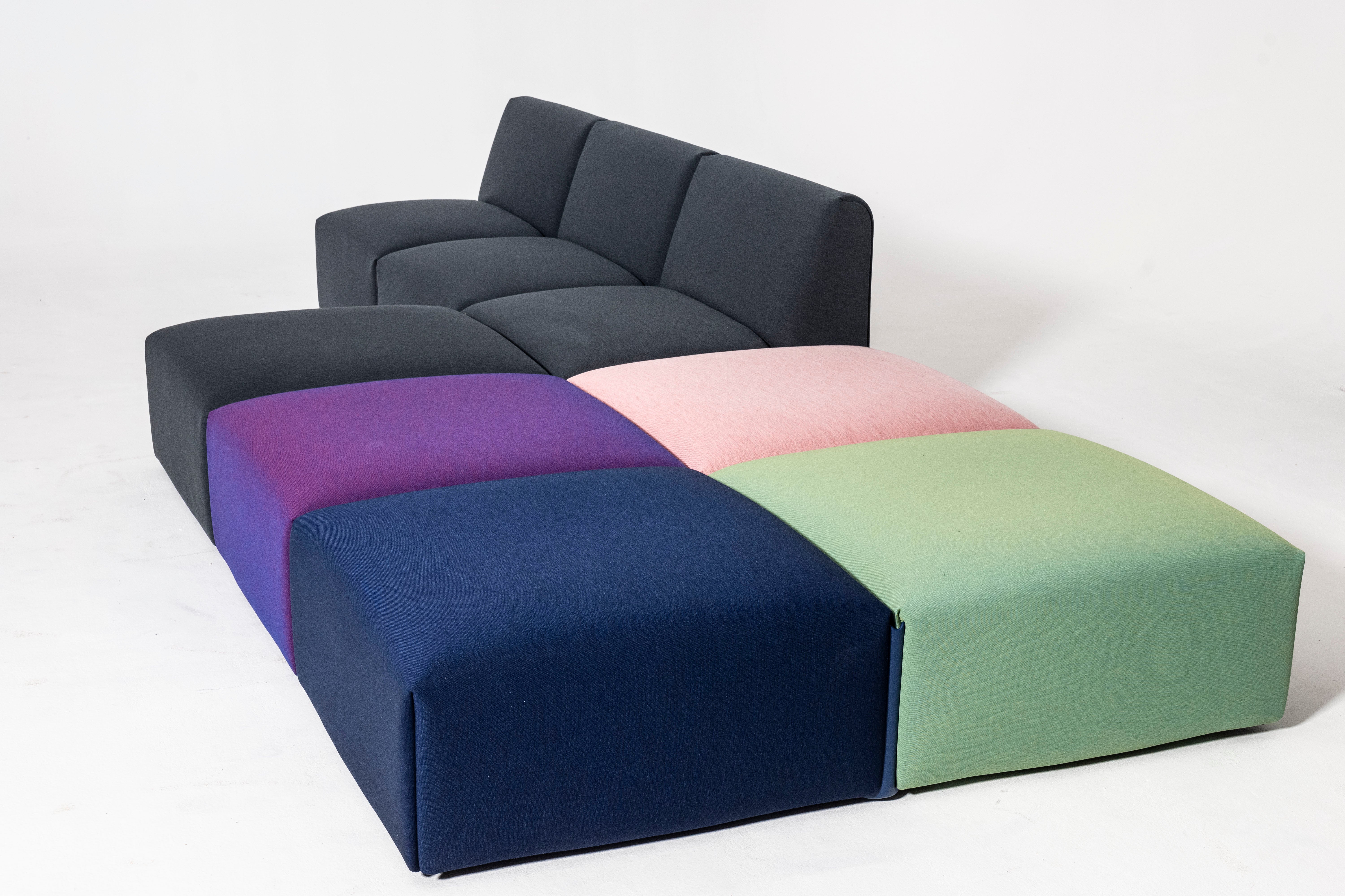 The modular form allows the ottoman to be used as a standalone seat, footrest, or as part of a larger sofa composition. Its geometric, minimalist shape and comfortable proportions work well in both private living rooms and commercial spaces.