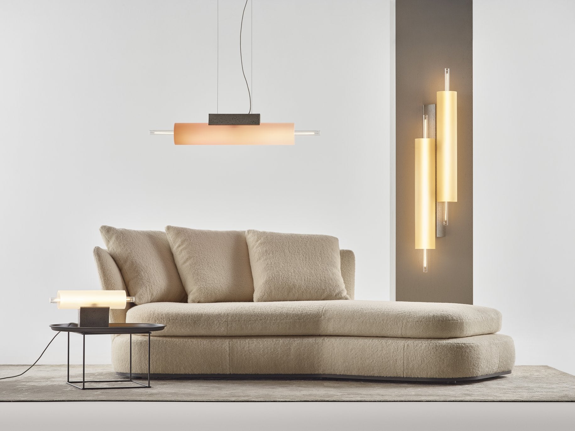 A characteristic element of the collection are inflatable, transparent glass tubes combined with a concrete frame, containing recycling glass. The concrete frame has a delicate sleeve of matt or transparent glass, through which it pierces the light, creating the effect of a levitating fluorescent lamp. Overlay allows you to create both single and complex light compositions, adding both light and artistic value to the interior.