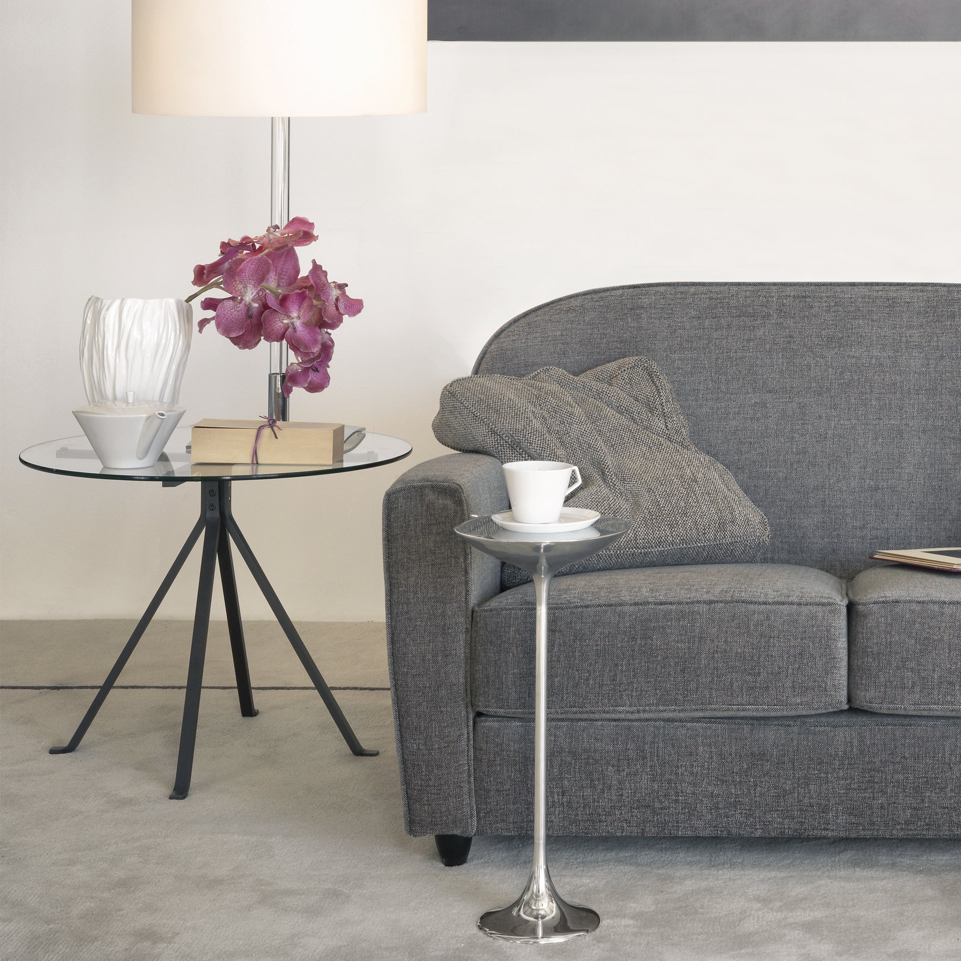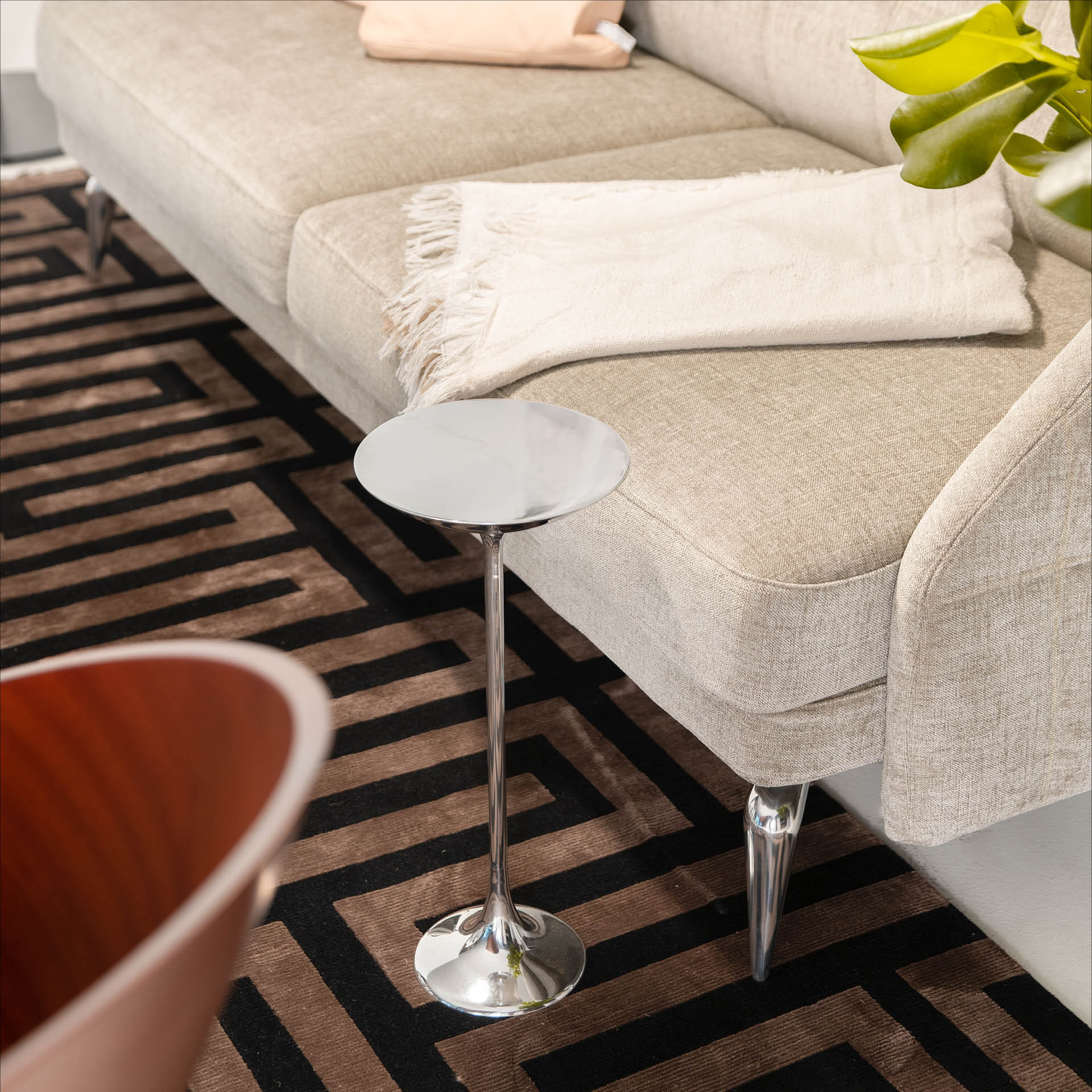 Ping and is distinguished by an elegant, minimalist form and a polished aluminum finish that gives it a noble character. This subtle table It not only facilitates the organization of space, but also introduces a note of nostalgia and sophistication to it. Ideal for interiors, in which both functionality and sophisticated aesthetics count.