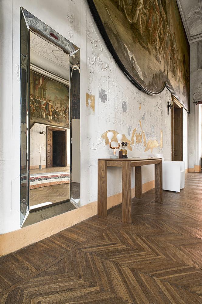Pleasure is rectangular mirror with large sizes, characterized by an elegant and modern design, which ensures versatility of suspension both vertically and horizontally. Its characteristic feature is a clear 10 cm wide frame made of curved, silver -plated glass, which adds extra splendor and character to this elegant mirror.