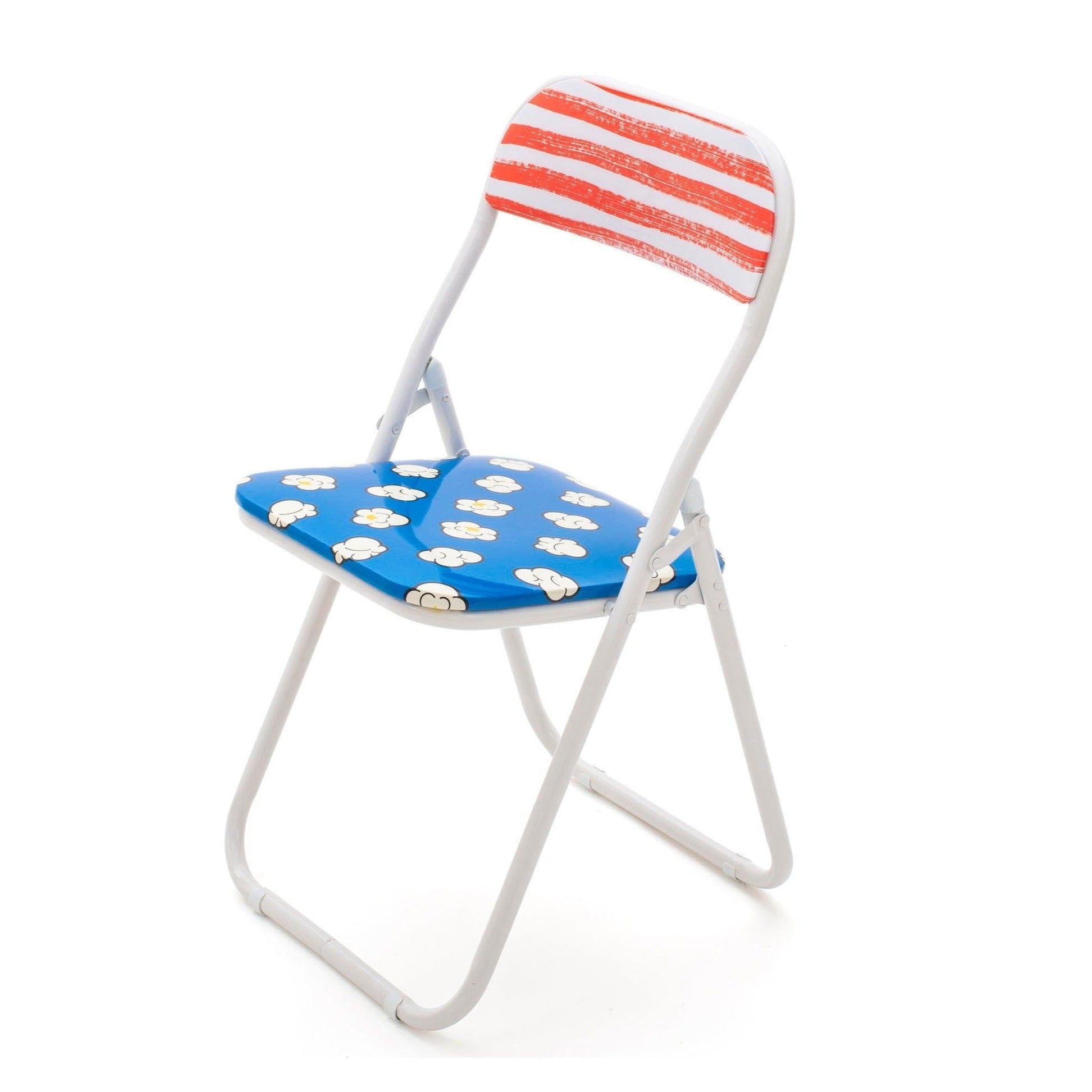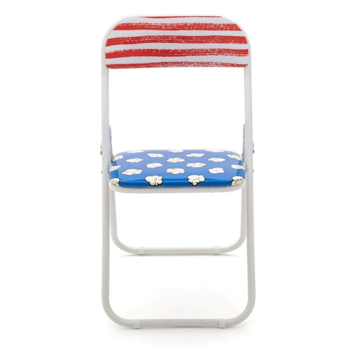 Designer folding chair In the style of pop art, it will give the interior a bit surreal and funny character. The whole is made of metal, and the dynamism full of dynamism and a slightly controversial collage create an original work of art.
