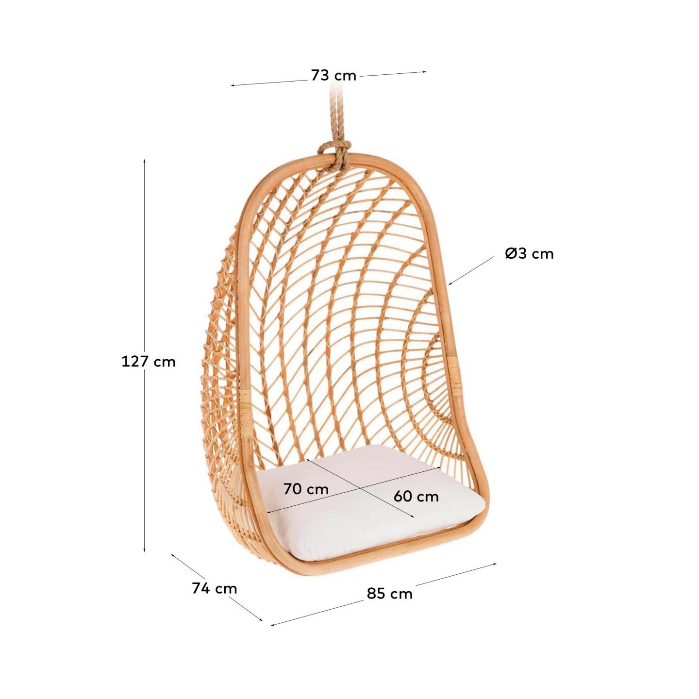 Hanging armchair This is a perfect combination of functionality, aesthetics and relaxation. Its unique design gives the interior of the house a subtle exotic charm, while providing a comfortable place to rest during sunny days outside. The attached pillows provide additional comfort, allowing you to break away from reality and immerse in moments of blissful relaxation.