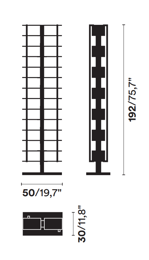 The solid steel construction and stainless steel finish make the Ptolomeo X2 not only striking but also exceptionally durable. With its symmetrical arrangement of shelves and the ability to be used from both sides, it fits perfectly in central points of rooms, adding lightness and order.