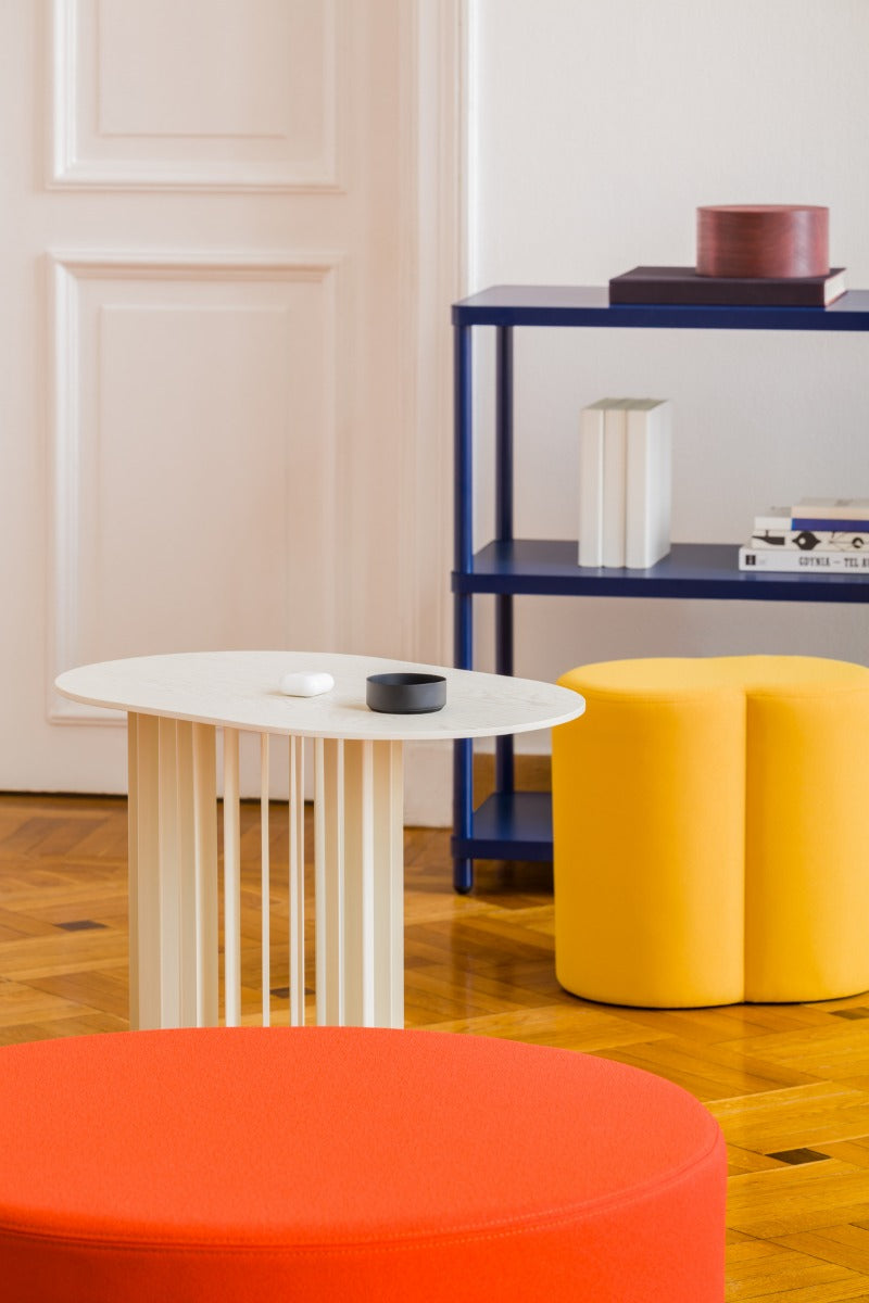 Roll Veneer side table with a metal base