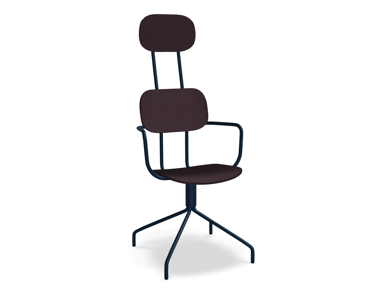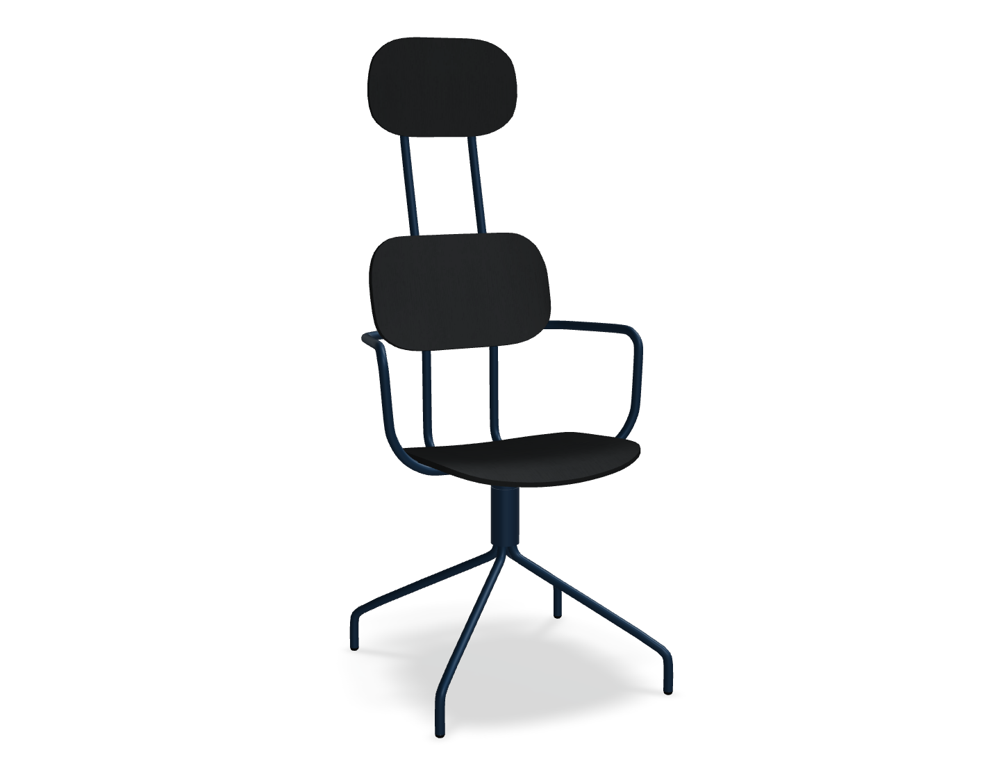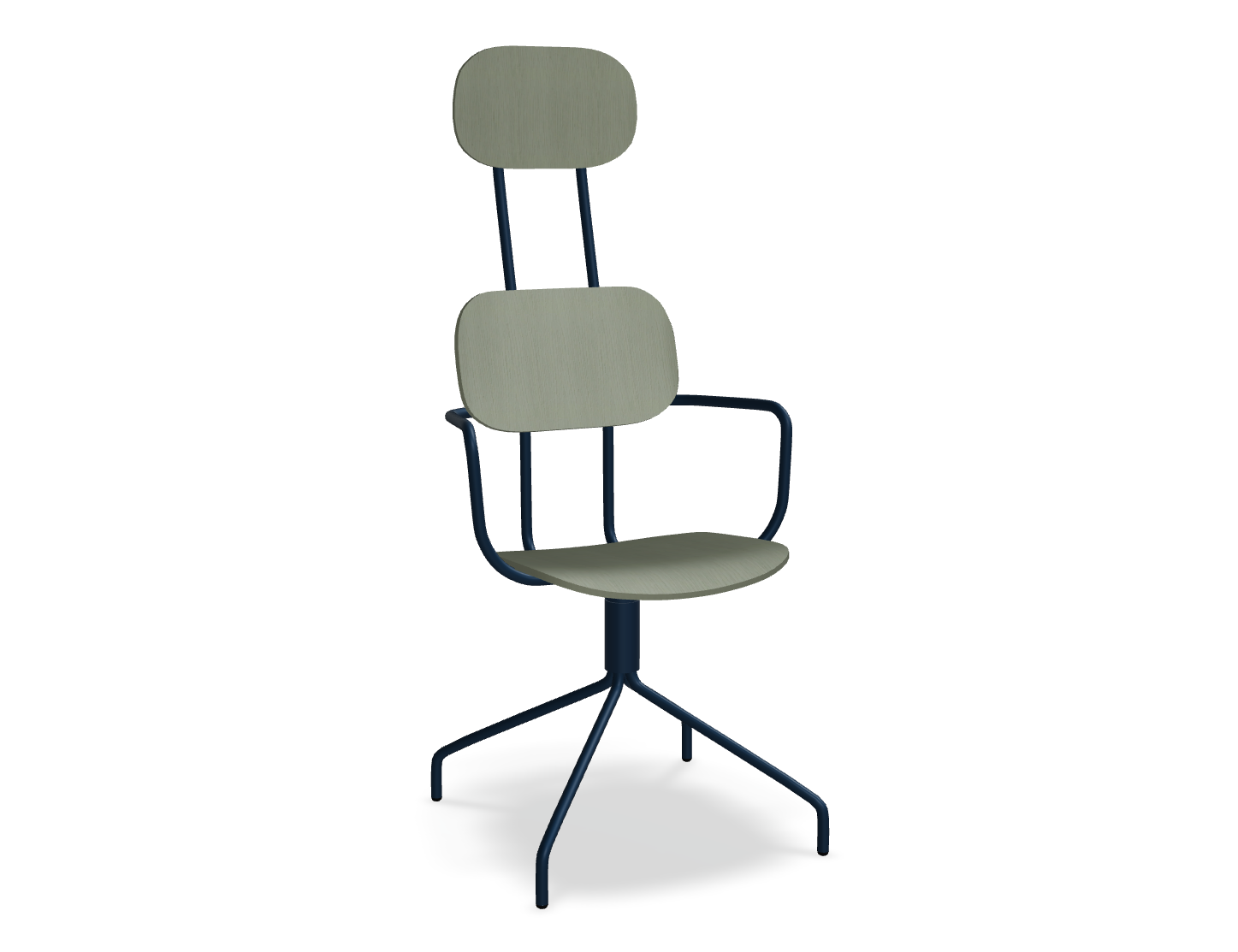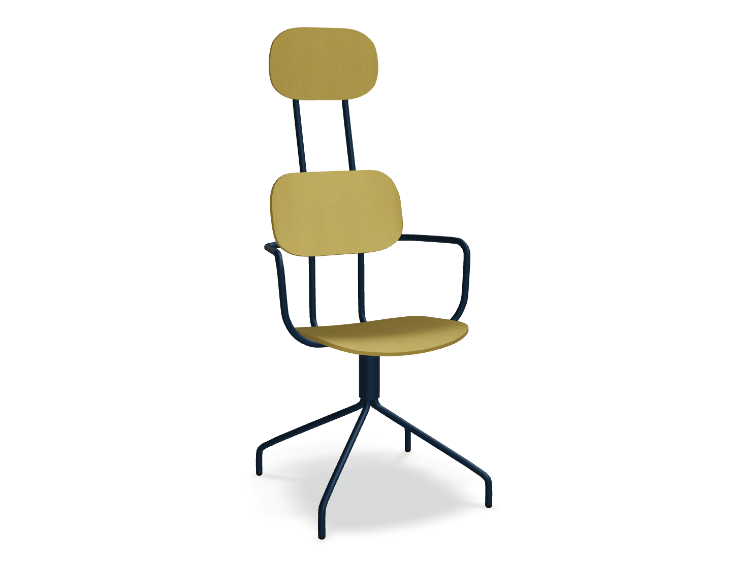 Swivel chair The new school with a headrest, designed by Studio Form US with Love, attracts attention with a modern form with double support. This backrest not only emphasizes modern design, but also provides excellent support for the whole back. The rotating base guarantees freedom of movement, and optional armrests further increase the comfort of use. The plywood version is distinguished by durability and ease of care, which makes it an ideal choice to the space used by many people.