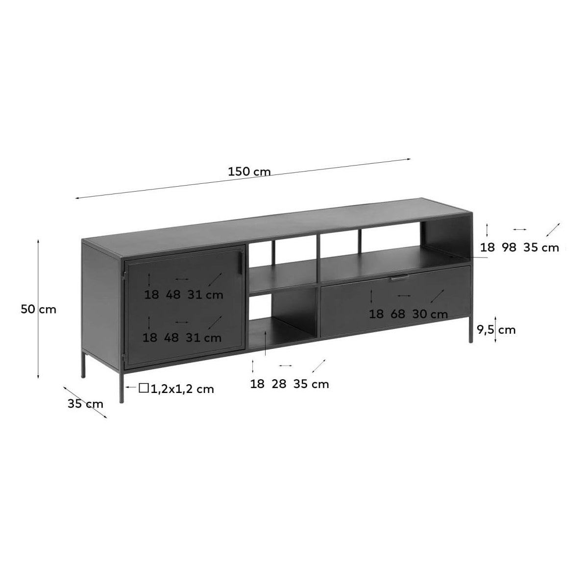 The black RTV cabinet Shantay is an exceptional piece made of steel, embodying a harmony of functionality and design. Its primary purpose is storage, making it an excellent choice for those seeking not only practical solutions but also aesthetic accents in their interior.