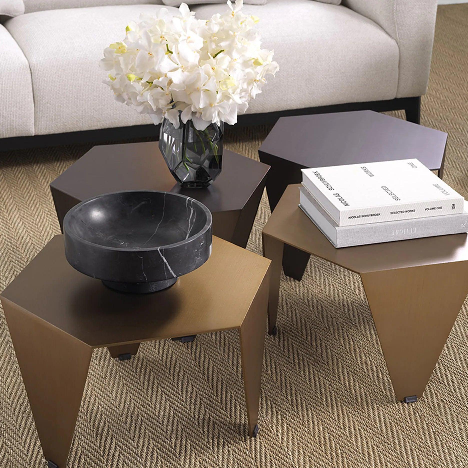 Table Metro Chic is a sophisticated combination of modern design with geometric grace. Its hexagonal countertop is a nod to contemporary interior design trends, emphasizing the originality and originalness of this furniture. Three elongated, narrowing legs add lightness of the structure, while maintaining the stability and durability of the table. A delicate bronze finish introduces a note of class and elegance to the interior.