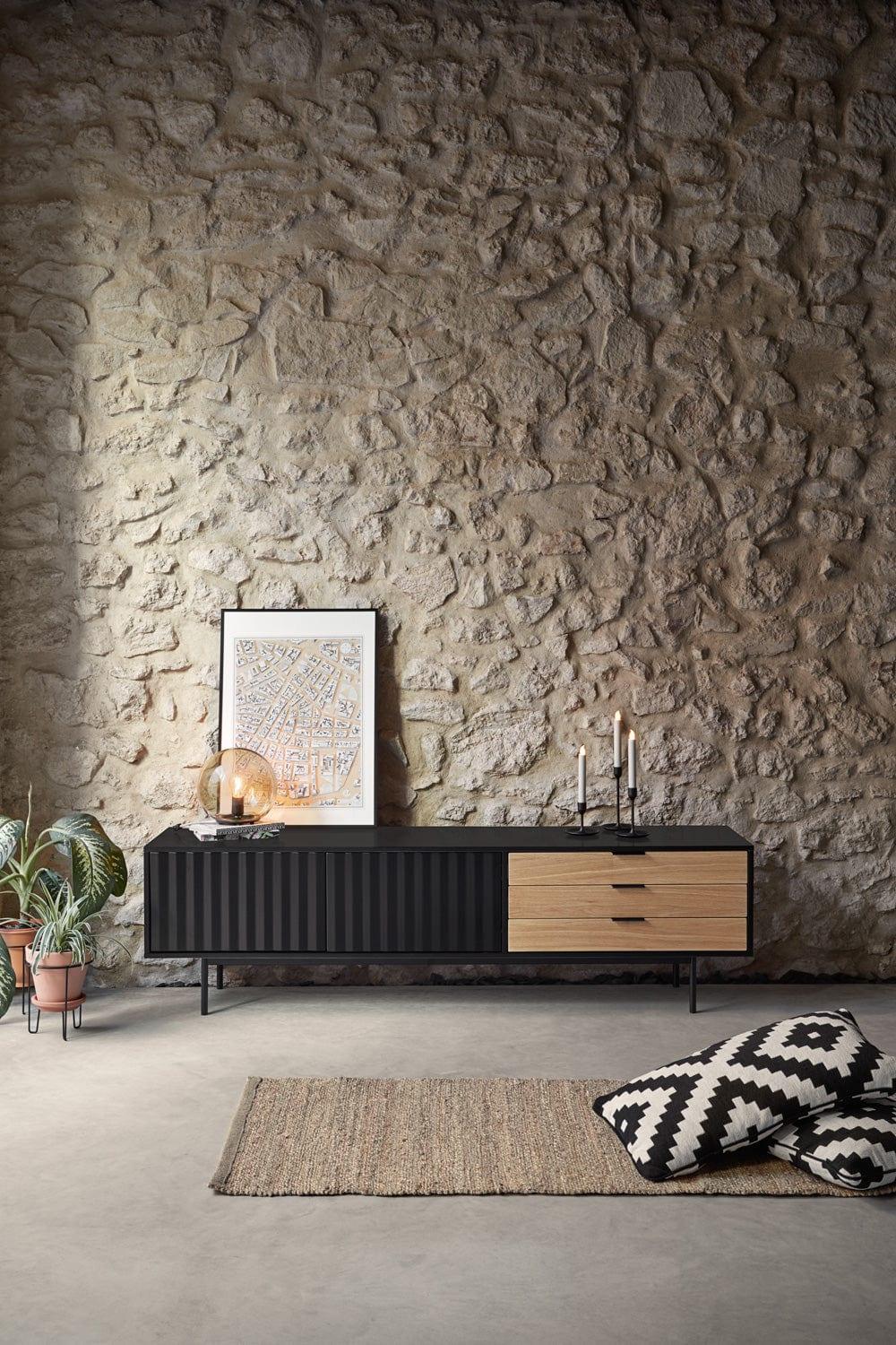 Like most projects from the Spanish brand Teulat, the TV cabinet Sierra is distinguished by its high-quality craftsmanship and adherence to classic forms. The combination of black and wood gives the cabinet a modern yet cozy appearance.