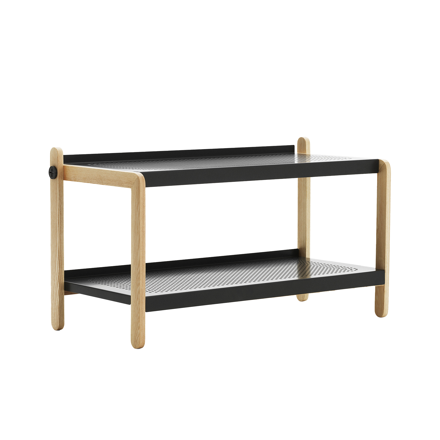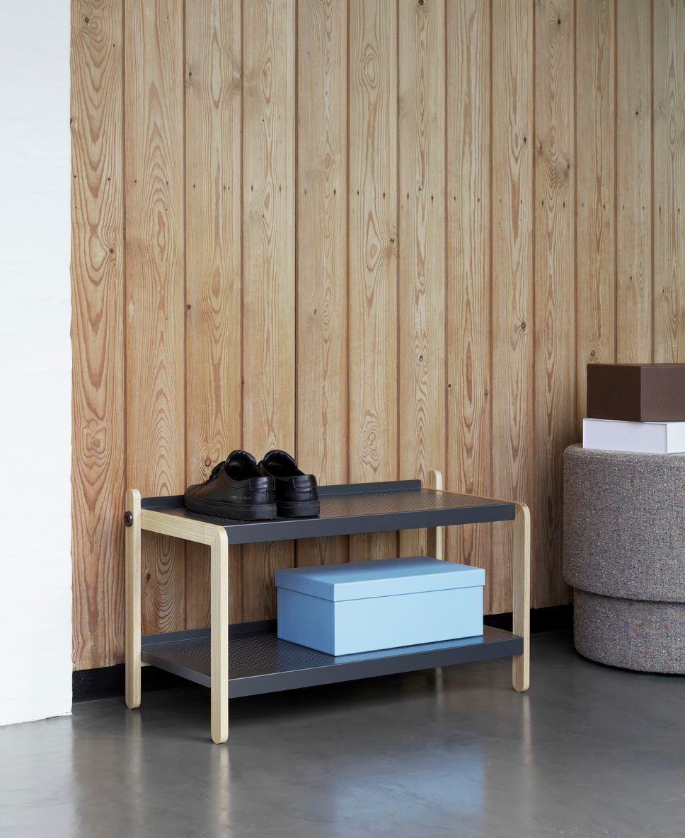 SKO shoe stand About industrial, and at the same time a simple character, made of solid, Scandinavian materials. It was designed without unnecessary elements, consisting of a wooden frame and two perforated steel shelves, which are connected by expressive screws.