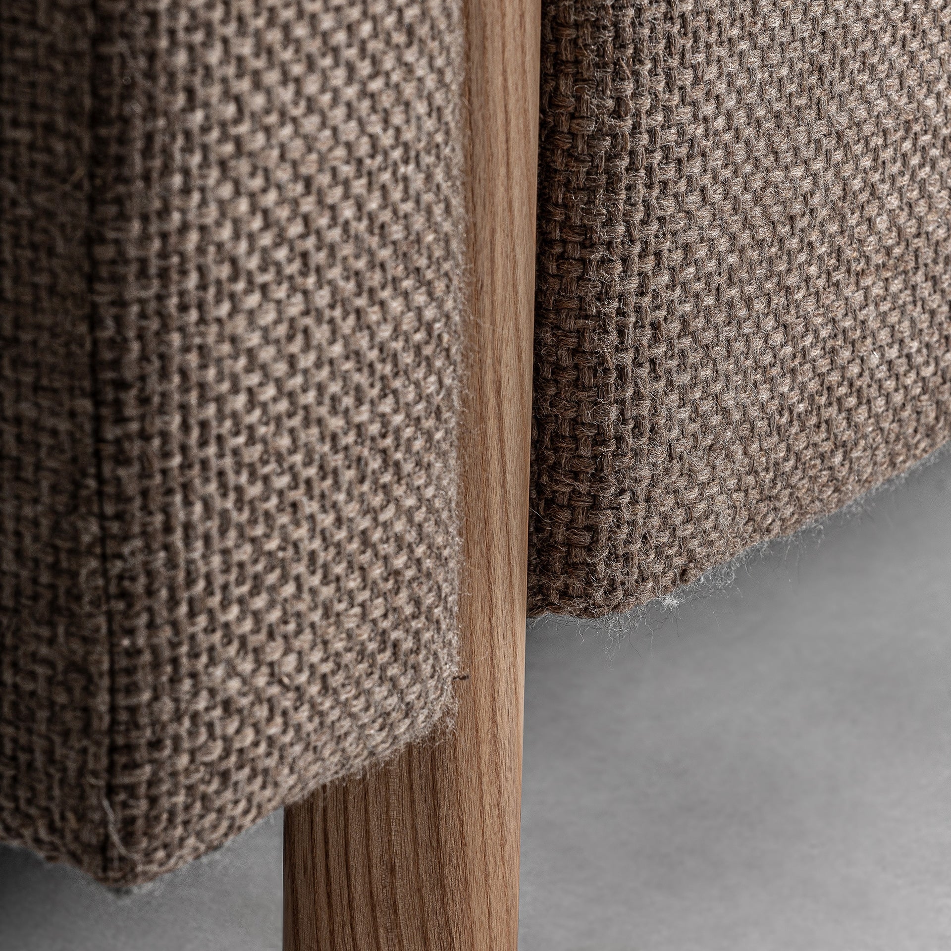 The seat and backrest are equipped with soft, removable cushions, enhancing comfort and making maintenance easy. This upholstered sofa combines comfort with practical solutions. The wooden construction ensures stability and durability, while the overall design maintains a cohesive, timeless character.