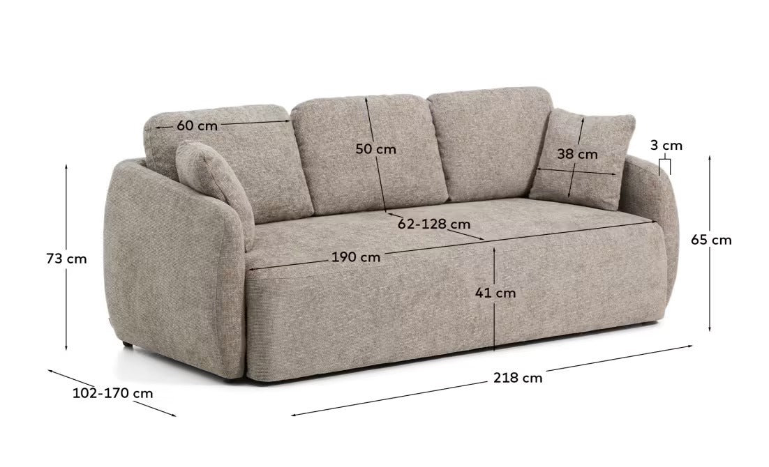 Sofa with sleeping function Laira stands out with high-quality upholstery made of chenille with a loose weave, which provides exceptional softness to the touch and high abrasion resistance. Thanks to the Y-open system, the sofa can be easily and quickly transformed into a comfortable bed measuring 150 x 190 cm at its longest point, thanks to the synchronized opening mechanism. When unfolded, it can also serve as a continuous chaise lounge, providing additional comfort.