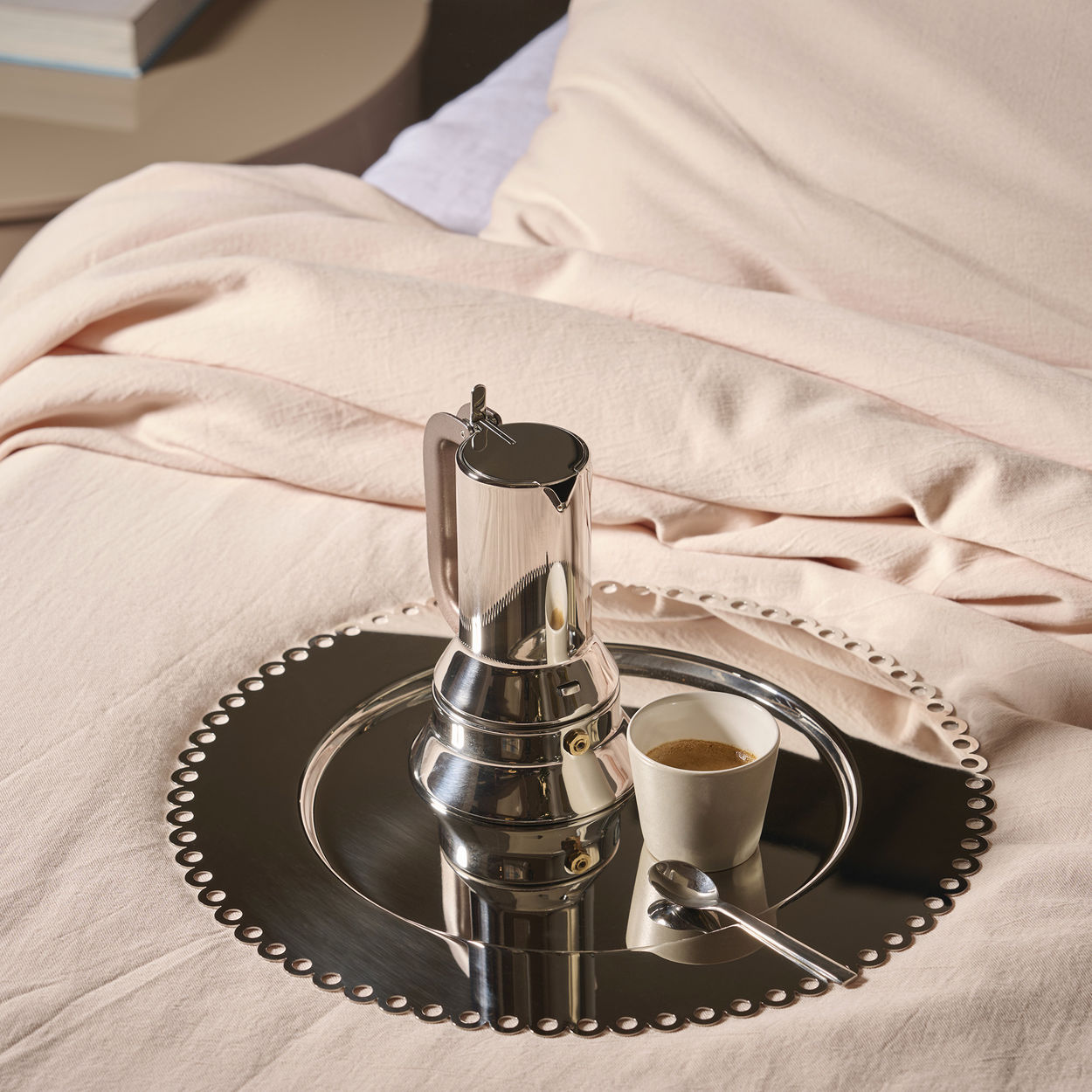 Serving Plate Edges is part of the Il Tornitore Matto collection, an experimental project by Alberto Alessi in collaboration with Giulio Iacchetti, exploring the relationship between design, industry, and craftsmanship. The design by Nika Zupanc draws from the power of a simple sign, giving it poetic and emotional depth. The distinctive edge with tiny holes, reminiscent of lace, refers to a personal memory of the designer and becomes a subtle detail that builds an intimate connection with the object while evoking shared cultural images.