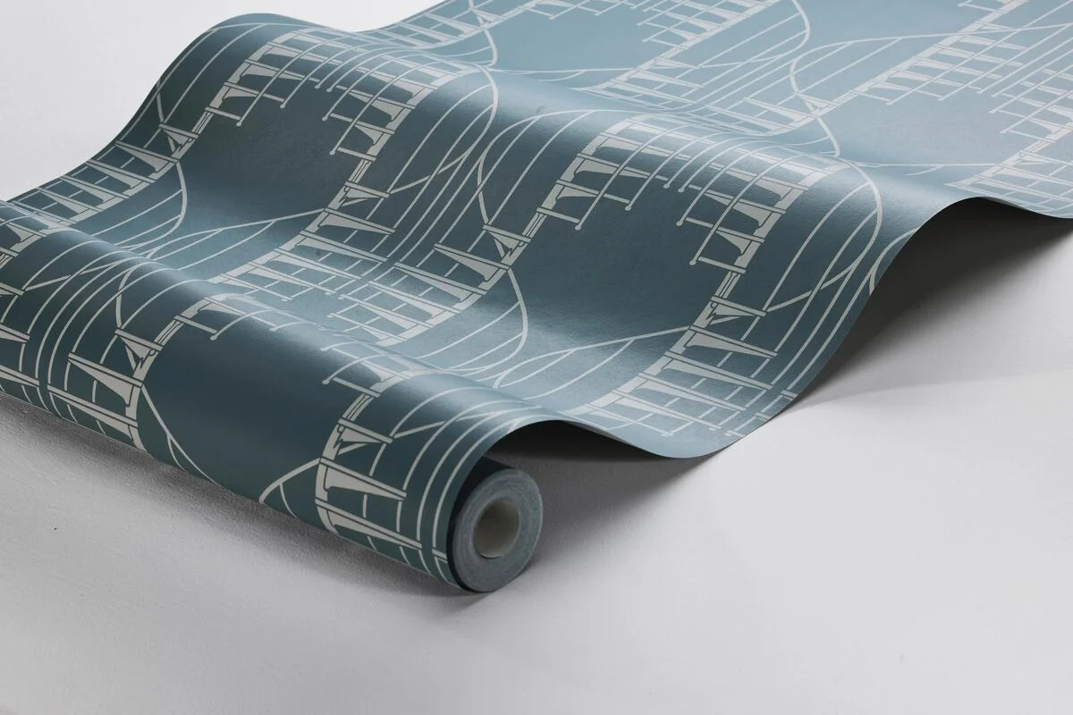 Wallpaper Staircase is a unique offering that brings an exceptional, Scandinavian charm of the 1950s into your space. The pattern, inspired by the drawing of Danish architect Bent Karlby, initially resembles organic waves that form the shape of a medal, but upon closer inspection, a precisely designed spiral staircase is revealed. The overall effect exudes a subtle retro style that combines elegance with a touch of playfulness.