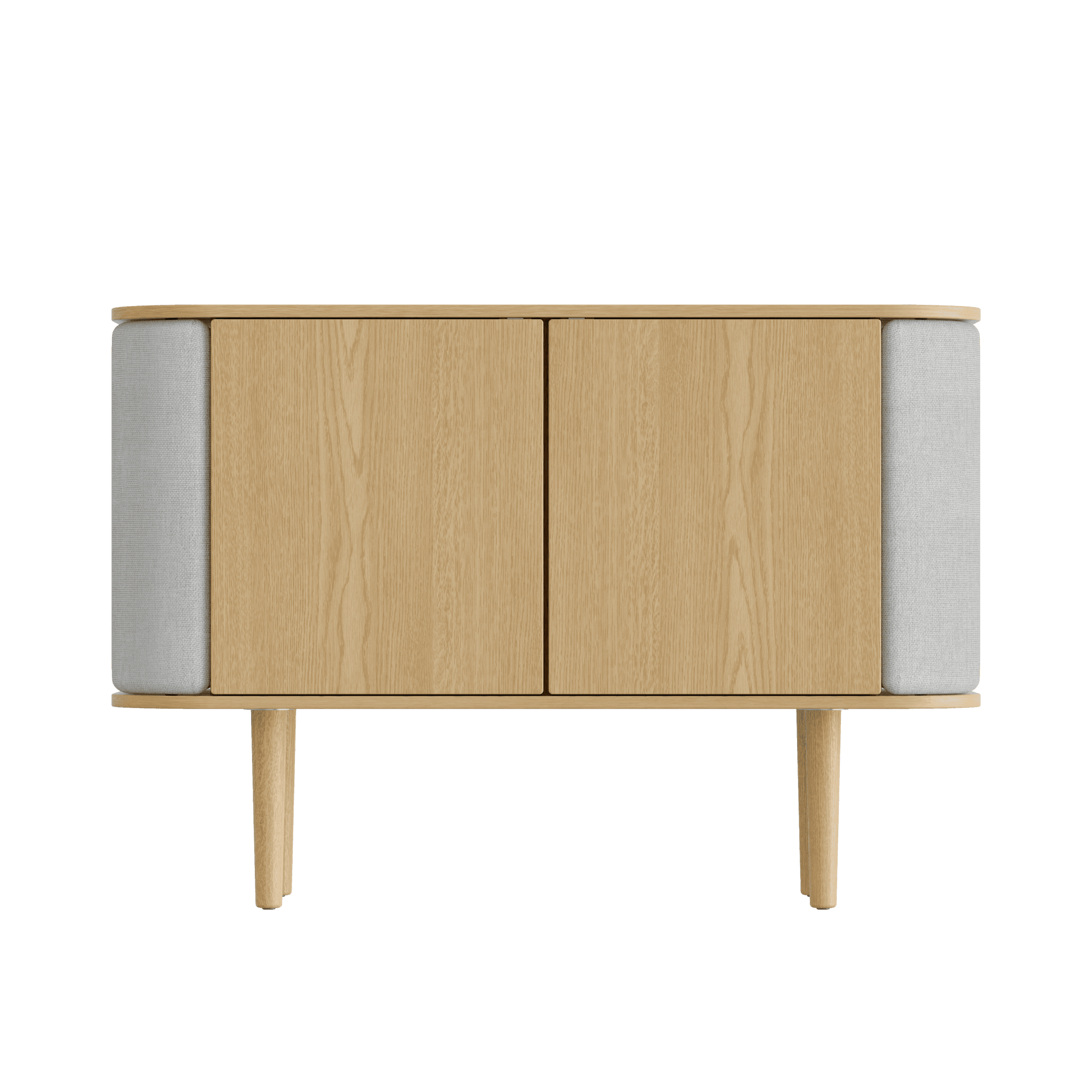 Dresser Treasures emanates a Nordic style. Its housing is made of veneered oak wood, and the curved sides of the cabinet have an adjustable cover, giving treasures a pleasant, soft touch.