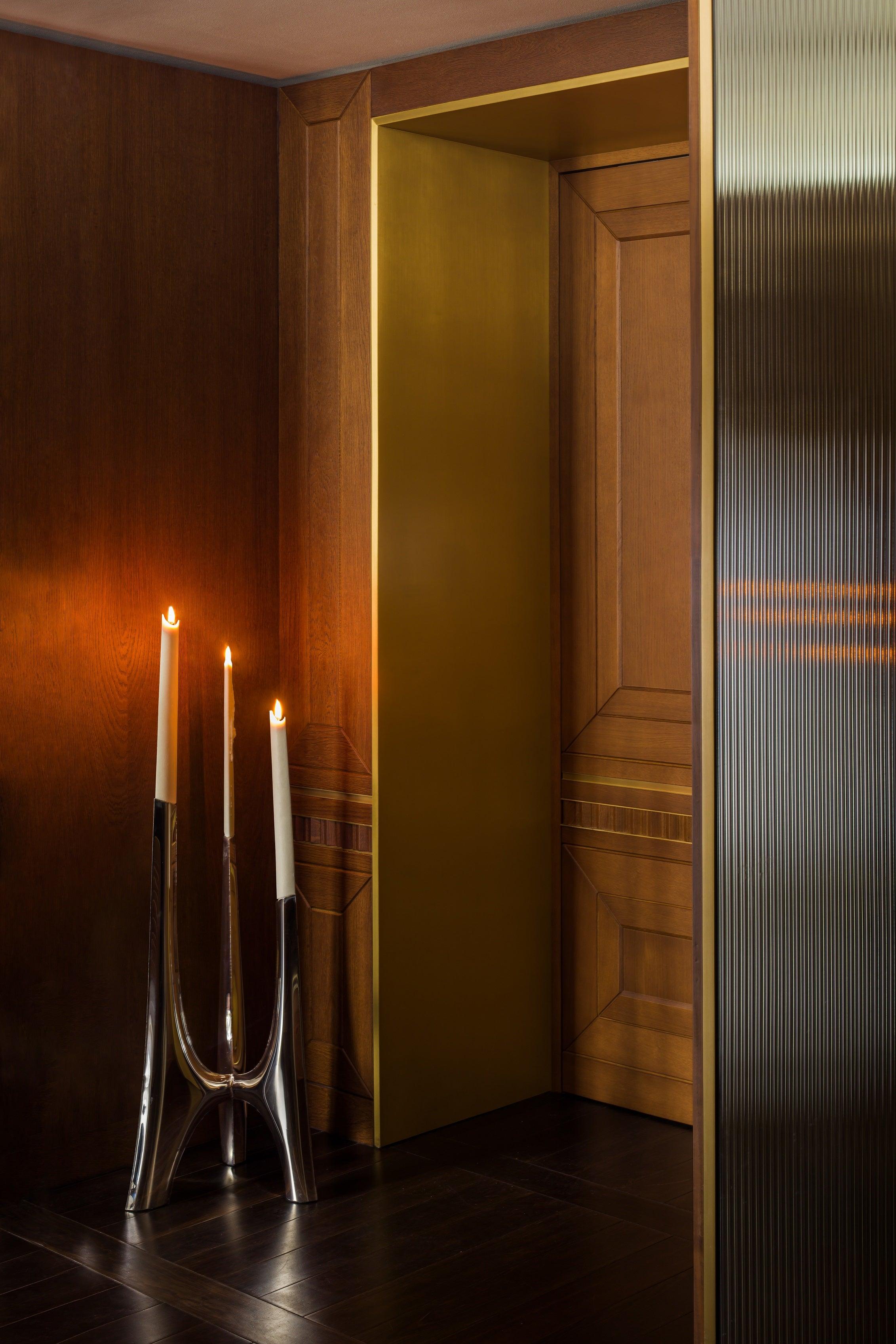 Triglav Candle Holder in inox color is a sculpture of fire and shadow, blooming in a magical dance of flames. The Harmony Candle Holder fills the room with a mystical glow, and its form reflects the harmony of the universe.