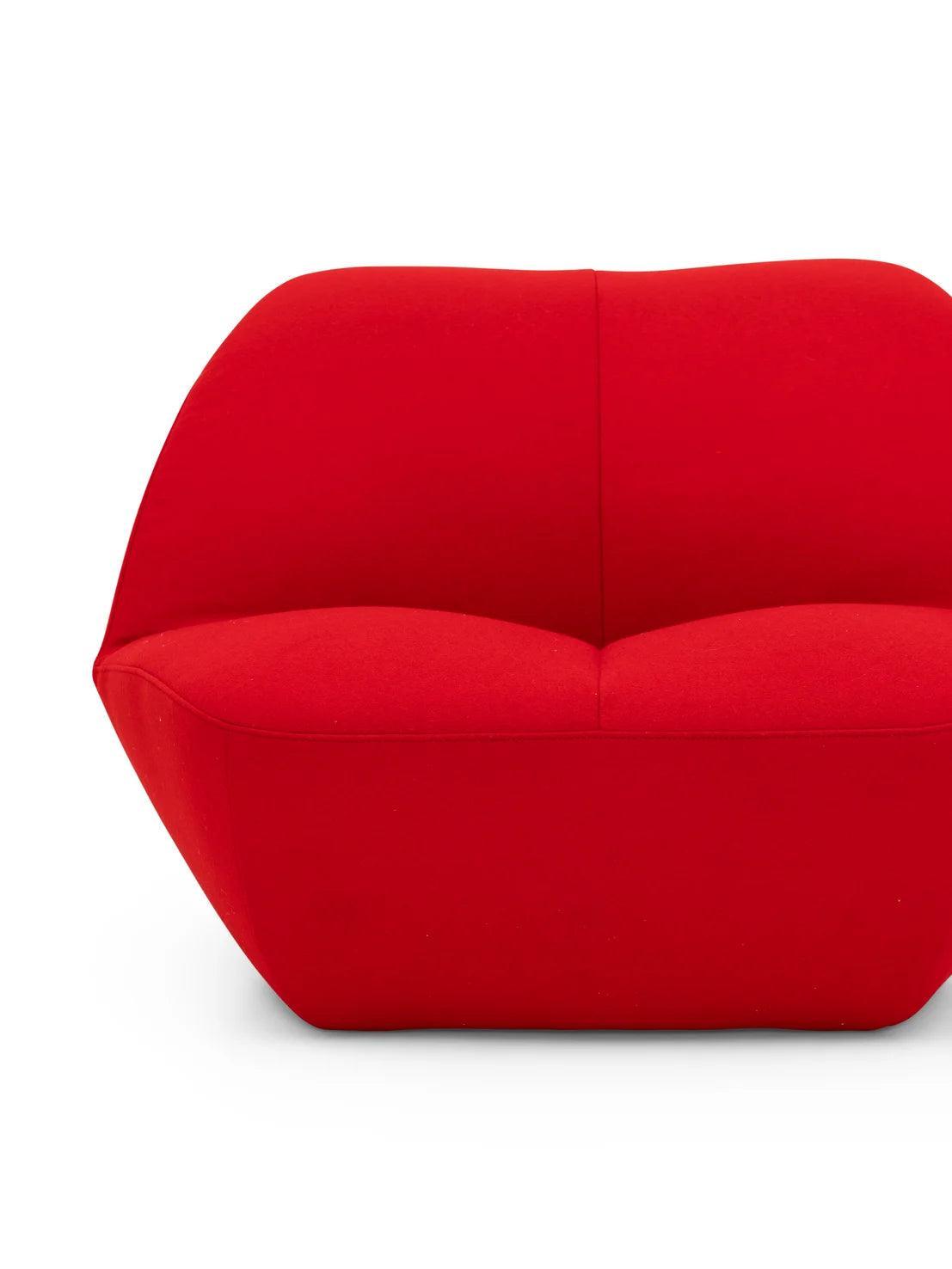 The KISSS Lounge Chair armchair is upholstered with 100% woolen Kvadrat Divina 3 fabric, offering a variety of color options. It is available for immediate shipping in the iconic red shade (Kvadrat Divina 3 623). It allows you to create unique configurations for each space, both large and small, constituting a bold artistic statement with Kisss Lounge Chair.