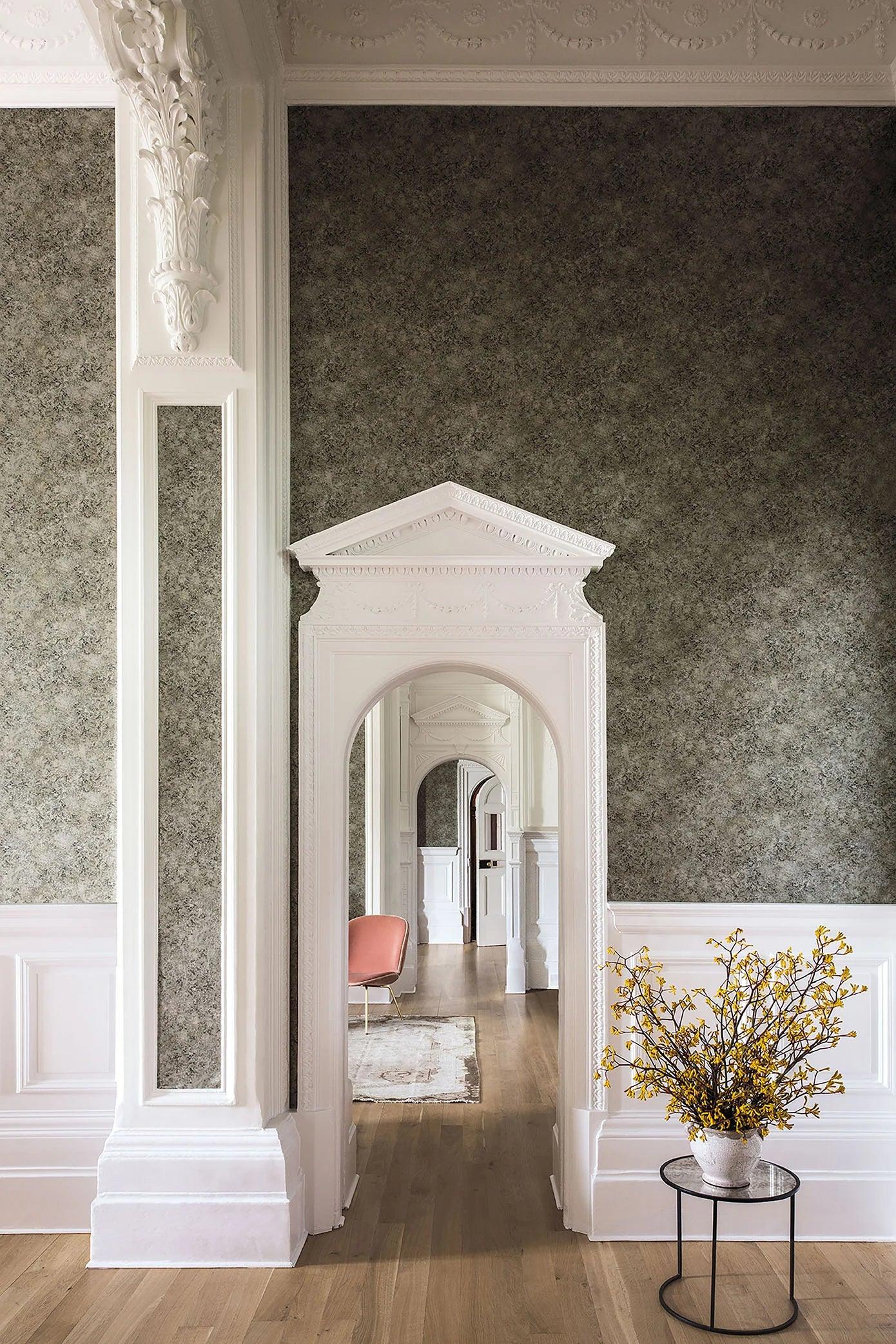 Wallpaper Patina Haze, creating the appearance of polished oxidized metal, is a faded, but luxurious wall veneer, which adds a delicate shine to any interior. It will be great in elegant spaces, as well as home ones.