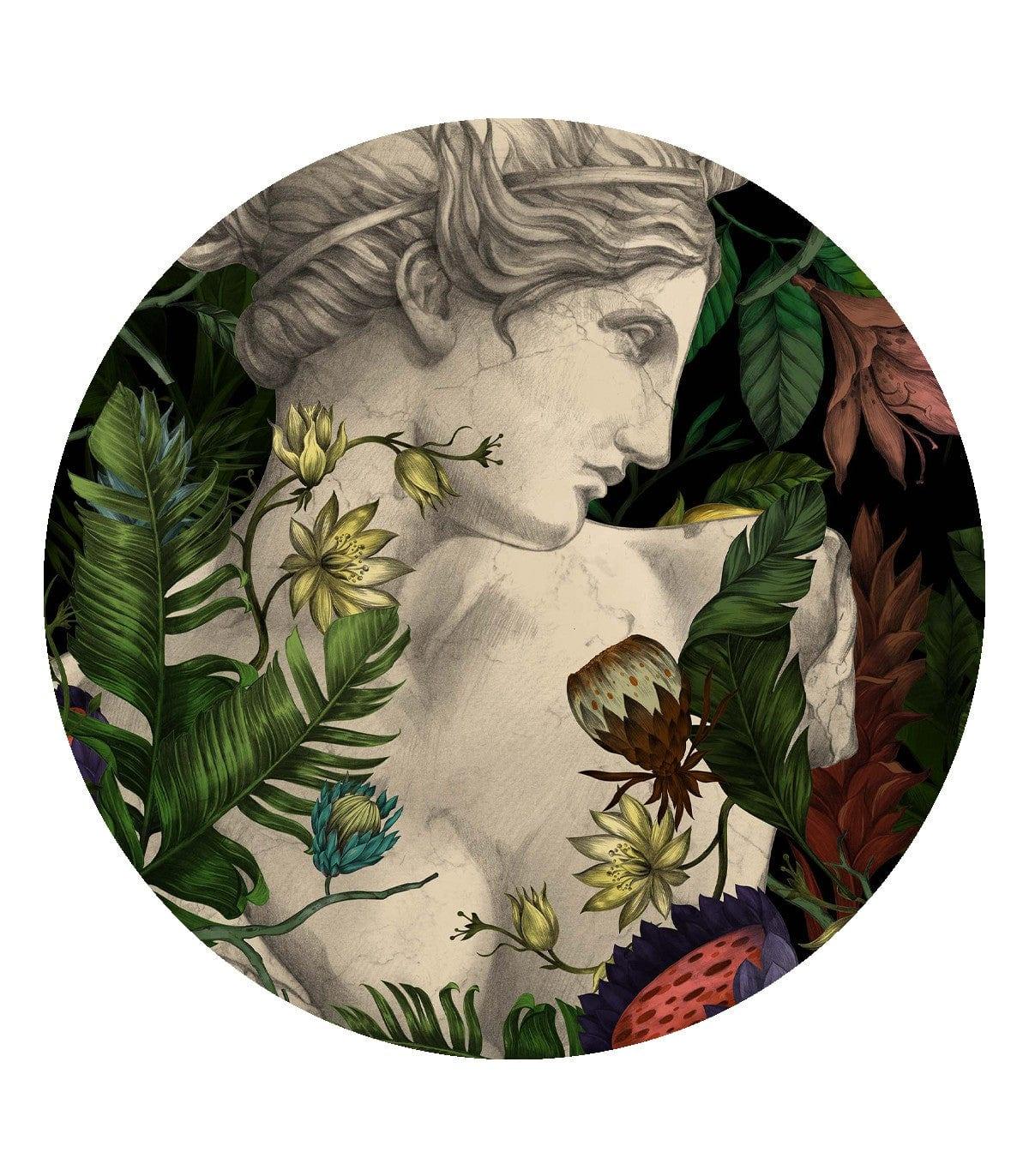The black background beautifully highlights the main element, which is the painting of a Greek sculpture, while the exotic vegetation offers an interesting alternative, making this wallpaper suitable for interiors in glamour, modern classic, as well as contemporary styles.