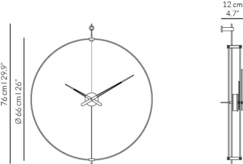 The double ring made of black fiberglass emphasizes the modern line of the design, while elements made of natural walnut and black lacquered walnut wood introduce a subtle contrast. The precise German UTS mechanism ensures quiet and reliable operation, making this wall clock not only a decoration but also a functional element for everyday use. It is a compact wall clock, perfect for modern and elegant spaces.