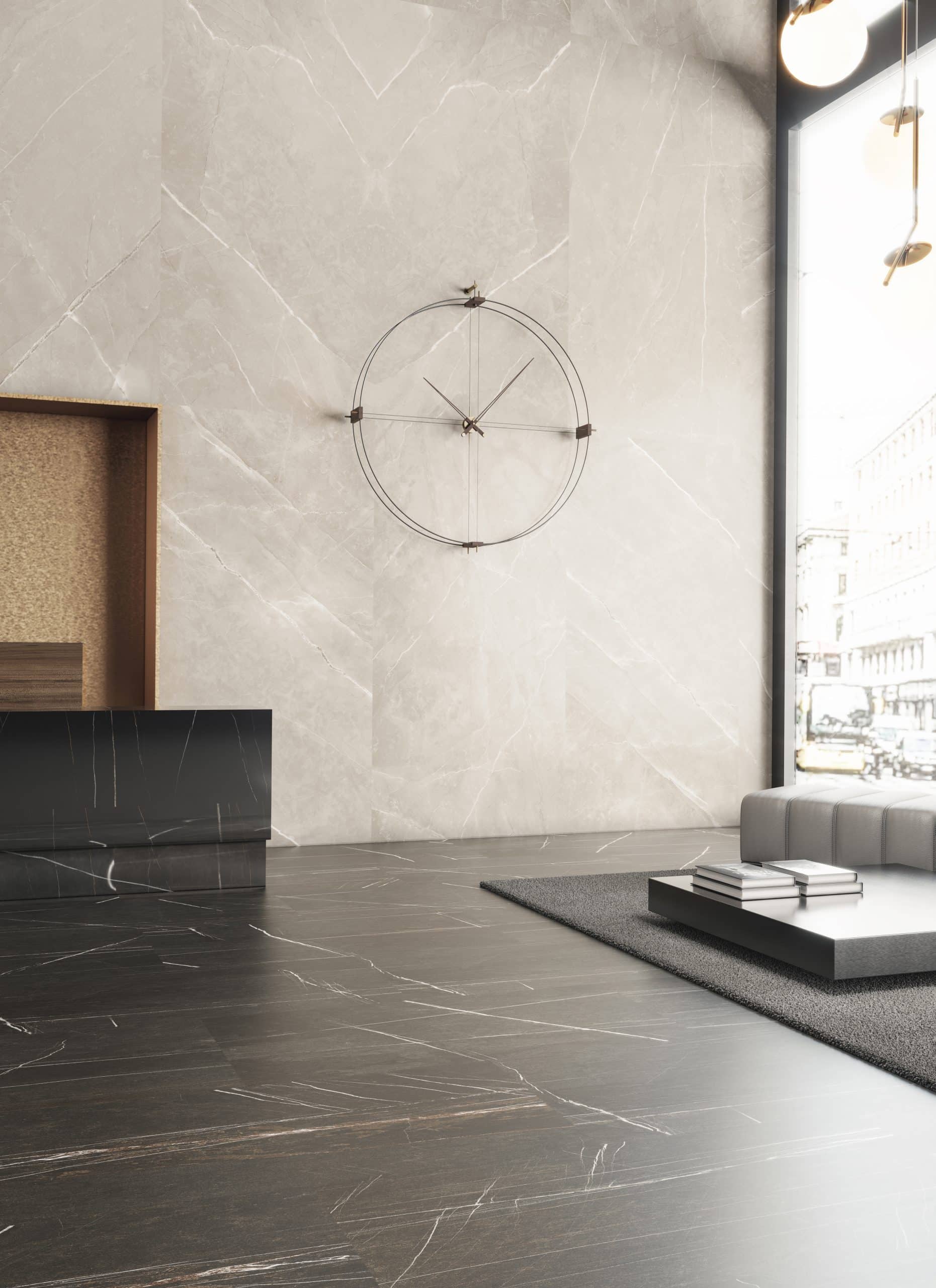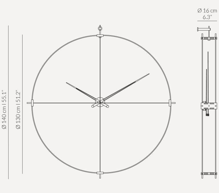 Delmori combines architectural scale with a subtle finish of details. It is available in a version with chrome brass or in a polished brass variant, and the ring comes in black. This designer wall clock, thanks to the German UTS mechanism, ensures precise and silent operation while maintaining a sculptural character.