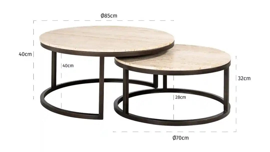 Elegant set of two coffee tables Avalon is a combination of the natural beauty of travertine and the modern form of a metal base. The round stone tops with subtle coloring add exceptional elegance to the interior, while the stable, geometric iron frames ensure durability and visual lightness. Thanks to the ability to slide one table under the other, the set is incredibly practical and perfectly suited for modern arrangements.